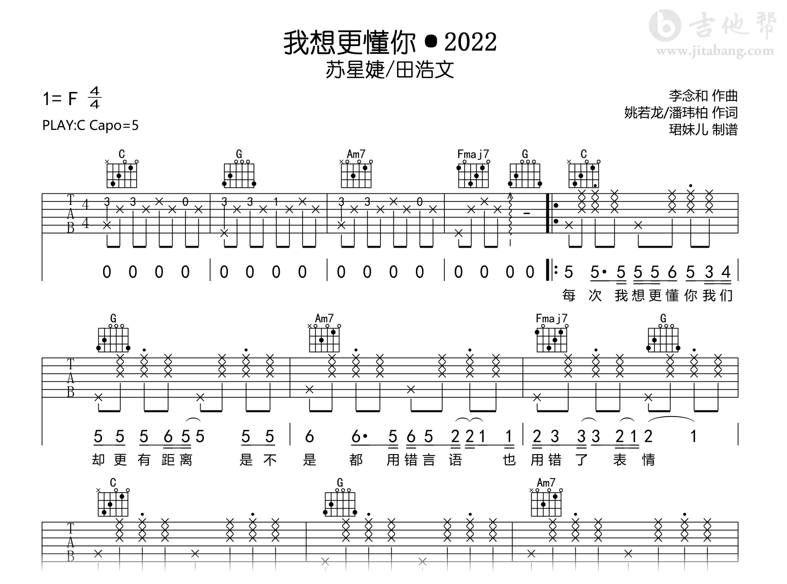 《苏星婕《我想更懂你·2022吉他谱》(C调)》内容来自于互联网,不能保证内容的准确性与完整性,仅供学习交流欣赏,请勿用于其它用途,内容版权归原作者及来源网站所有,如有侵犯到您的权益请来信告知,我们将及时删除。
