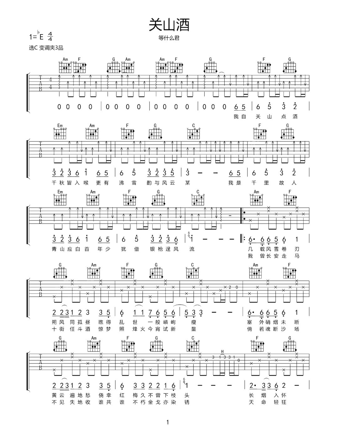 等什么君《关山酒吉他谱》(C调)
