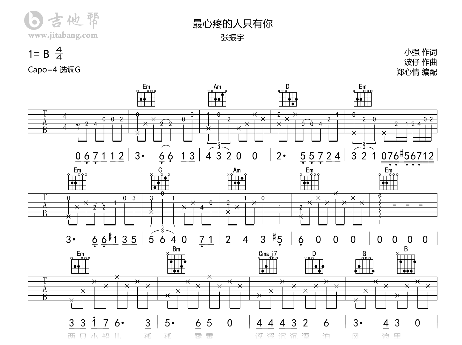 张振宇演唱的《最心疼的人只有你》吉他谱以原调B调为基础,使用G调指法编排,适配了变调夹夹第4品的方式,当然也可以根据自己的音域需求来调整变调夹的位置。这首歌曲并不像撕心裂肺的伤痛般深刻,也不会让人无尽哭泣。它传达出一种温情和安慰的情感,歌声向所有为爱而受伤的人