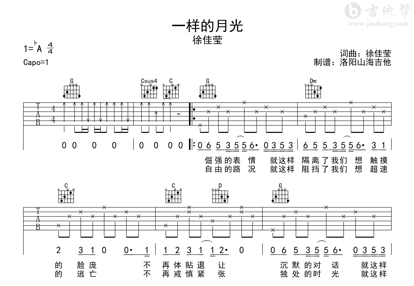《徐佳莹《一样的月光吉他谱》(G调)》内容来自于互联网,不能保证内容的准确性与完整性,仅供学习交流欣赏,请勿用于其它用途,内容版权归原作者及来源网站所有,如有侵犯到您的权益请来信告知,我们将及时删除。