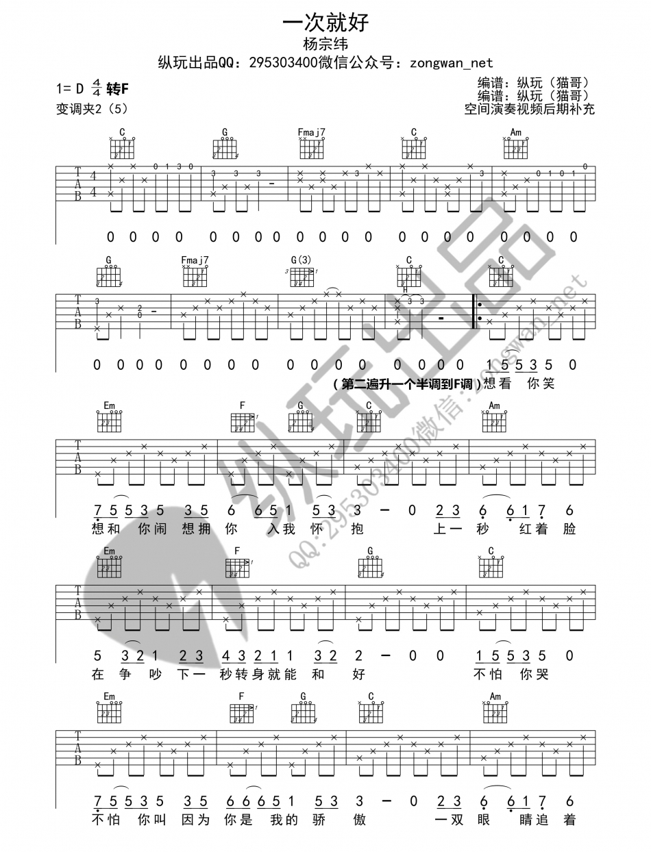 《杨宗纬《一次就好吉他谱》》内容来自于互联网,不能保证内容的准确性与完整性,仅供学习交流欣赏,请勿用于其它用途,内容版权归原作者及来源网站所有,如有侵犯到您的权益请来信告知,我们将及时删除。