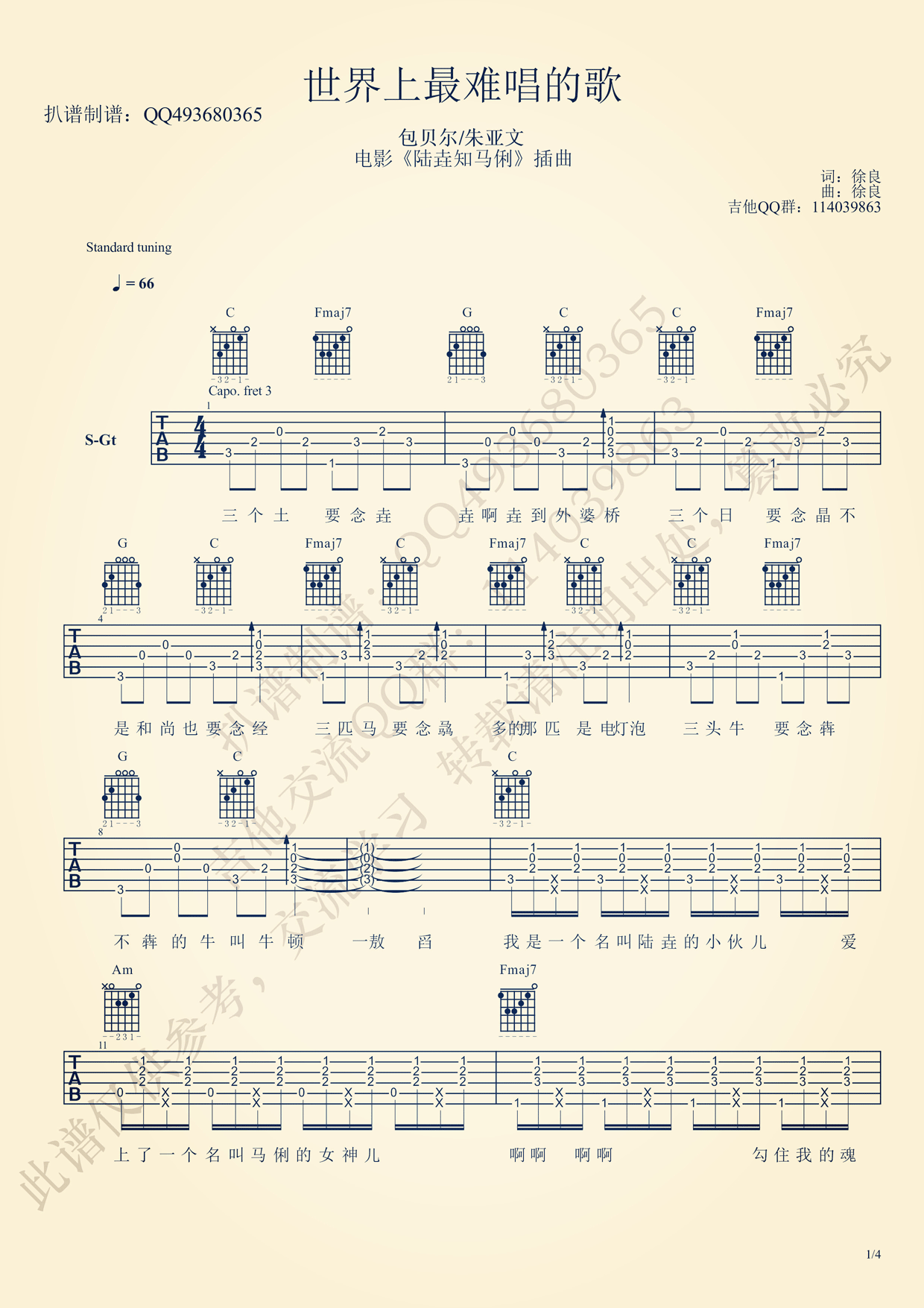 《《世界上最难唱的歌吉他谱》》内容来自于互联网,不能保证内容的准确性与完整性,仅供学习交流欣赏,请勿用于其它用途,内容版权归原作者及来源网站所有,如有侵犯到您的权益请来信告知,我们将及时删除。