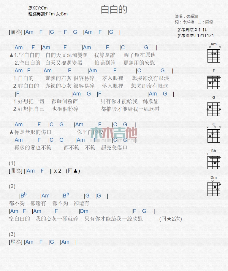 《张韶涵《白白的吉他谱》》内容来自于互联网,不能保证内容的准确性与完整性,仅供学习交流欣赏,请勿用于其它用途,内容版权归原作者及来源网站所有,如有侵犯到您的权益请来信告知,我们将及时删除。