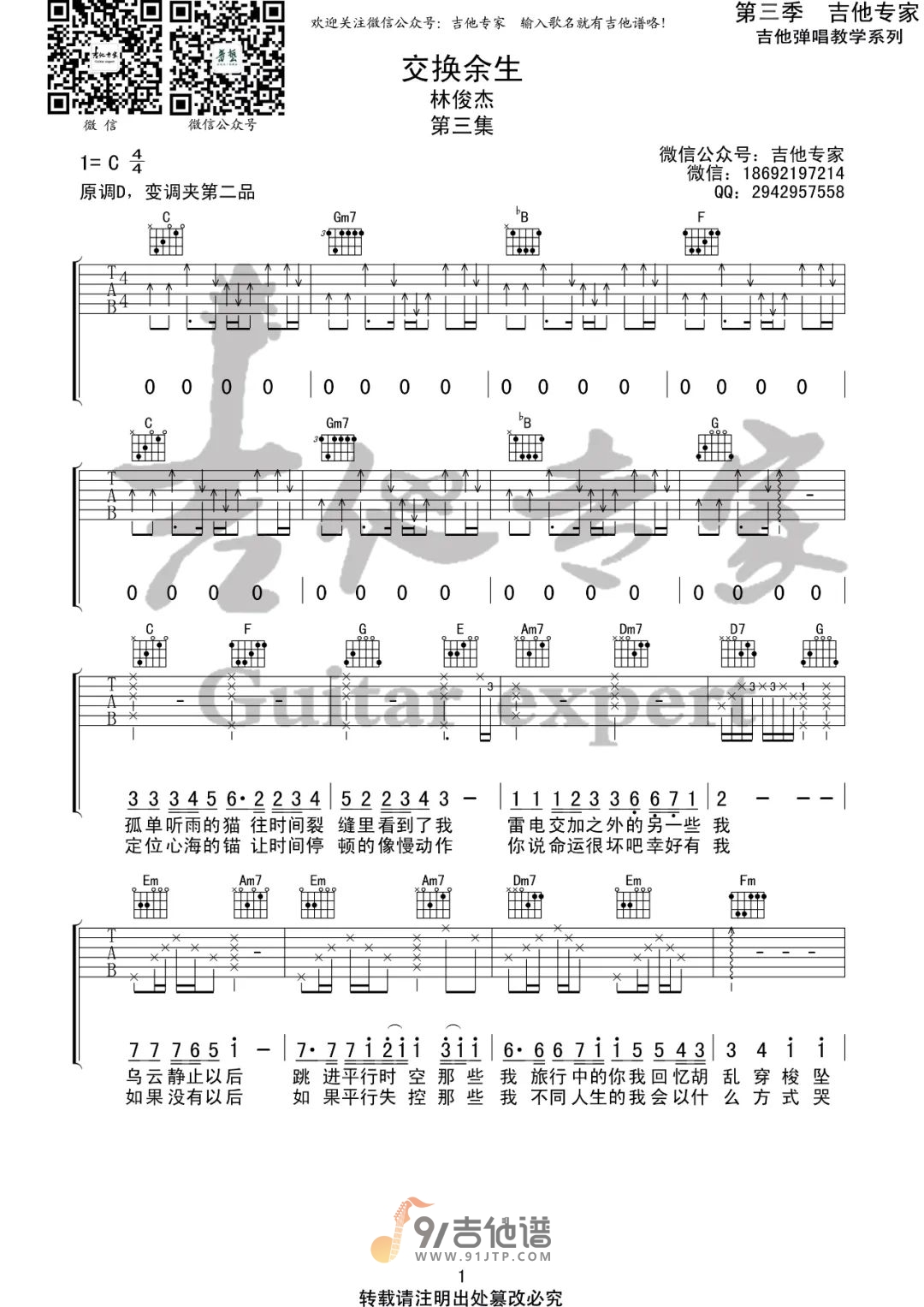 《林俊杰《交换余生吉他谱》(C调)》内容来自于互联网,不能保证内容的准确性与完整性,仅供学习交流欣赏,请勿用于其它用途,内容版权归原作者及来源网站所有,如有侵犯到您的权益请来信告知,我们将及时删除。