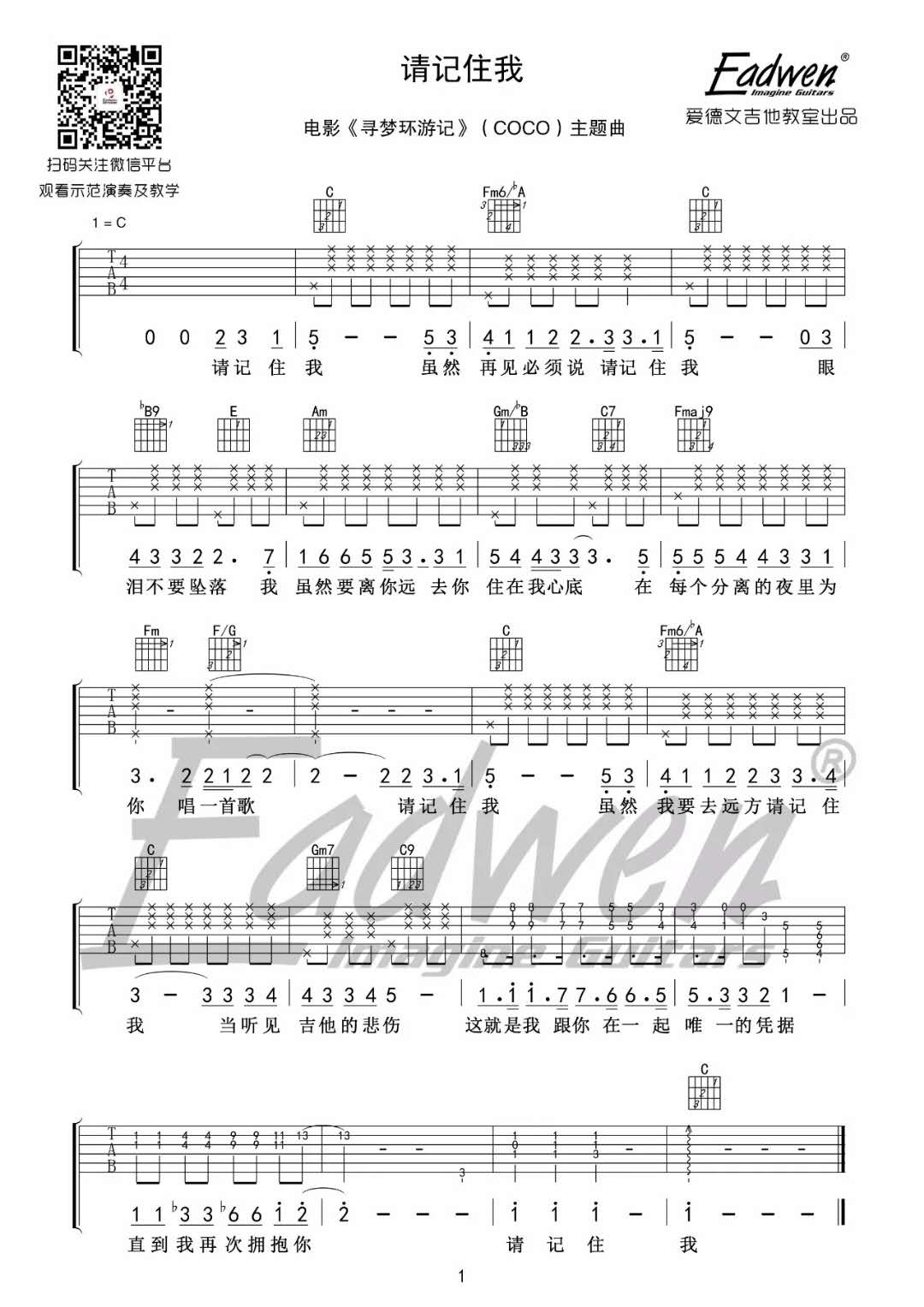 这是电影《寻梦环游记》的中文主题曲,曲谱图文详细介绍了这首动人心弦的歌曲。歌曲源自电影,以深情的旋律和感人至深的歌词展现了家庭、梦想和传承的主题。曲谱图示清晰,方便乐手学习演奏。这首歌曲不仅在影片中引起共鸣,也成为观众心中的经典之作。通过这份曲谱,人们可以感受