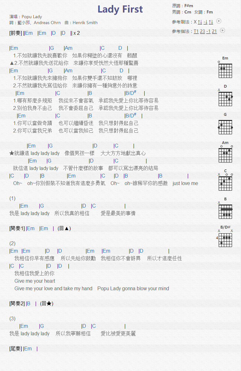 《《Lady First吉他谱》》内容来自于互联网,不能保证内容的准确性与完整性,仅供学习交流欣赏,请勿用于其它用途,内容版权归原作者及来源网站所有,如有侵犯到您的权益请来信告知,我们将及时删除。