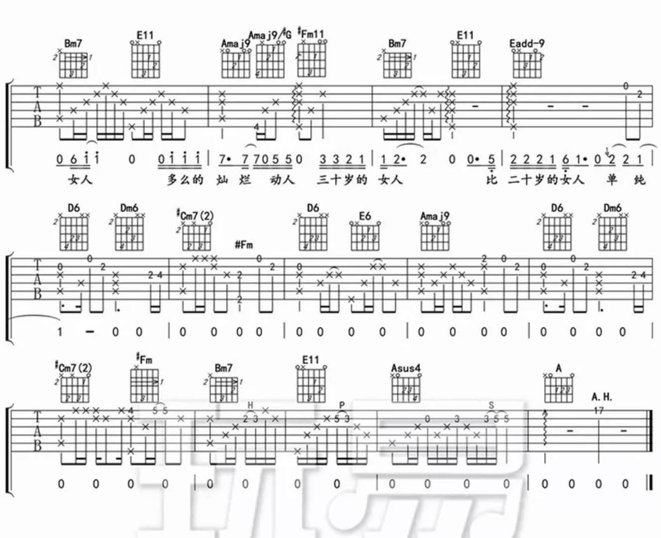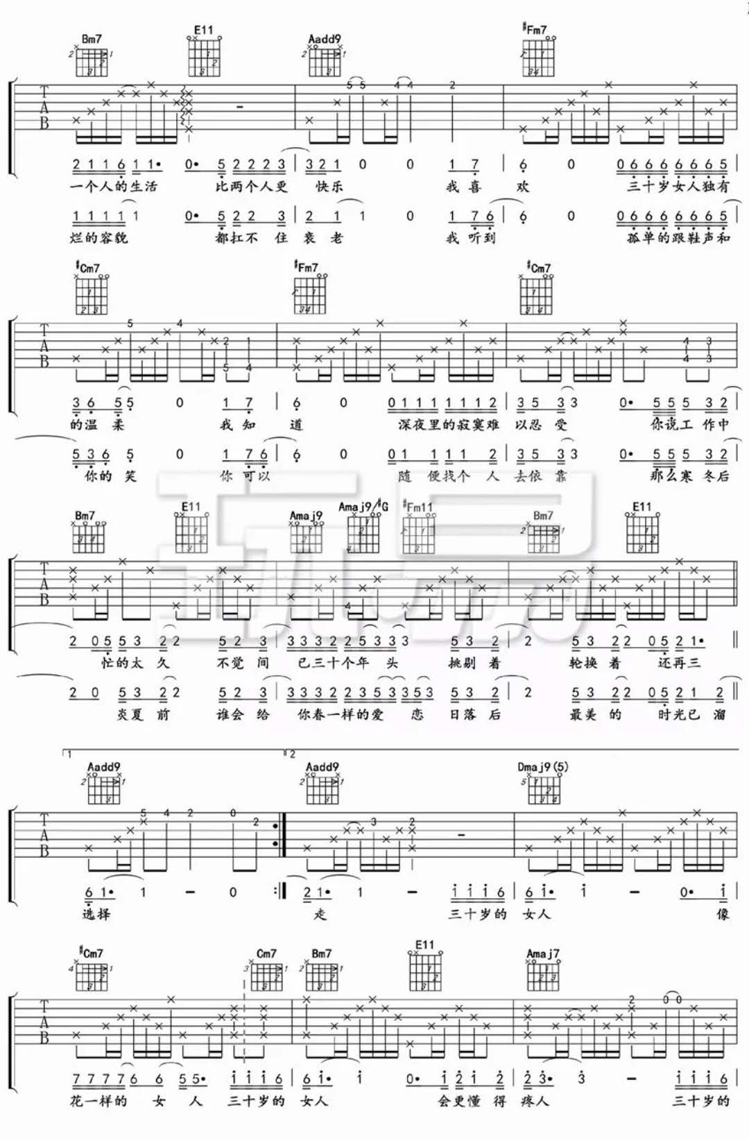 《谭维维《三十岁的女人吉他谱》》内容来自于互联网,不能保证内容的准确性与完整性,仅供学习交流欣赏,请勿用于其它用途,内容版权归原作者及来源网站所有,如有侵犯到您的权益请来信告知,我们将及时删除。