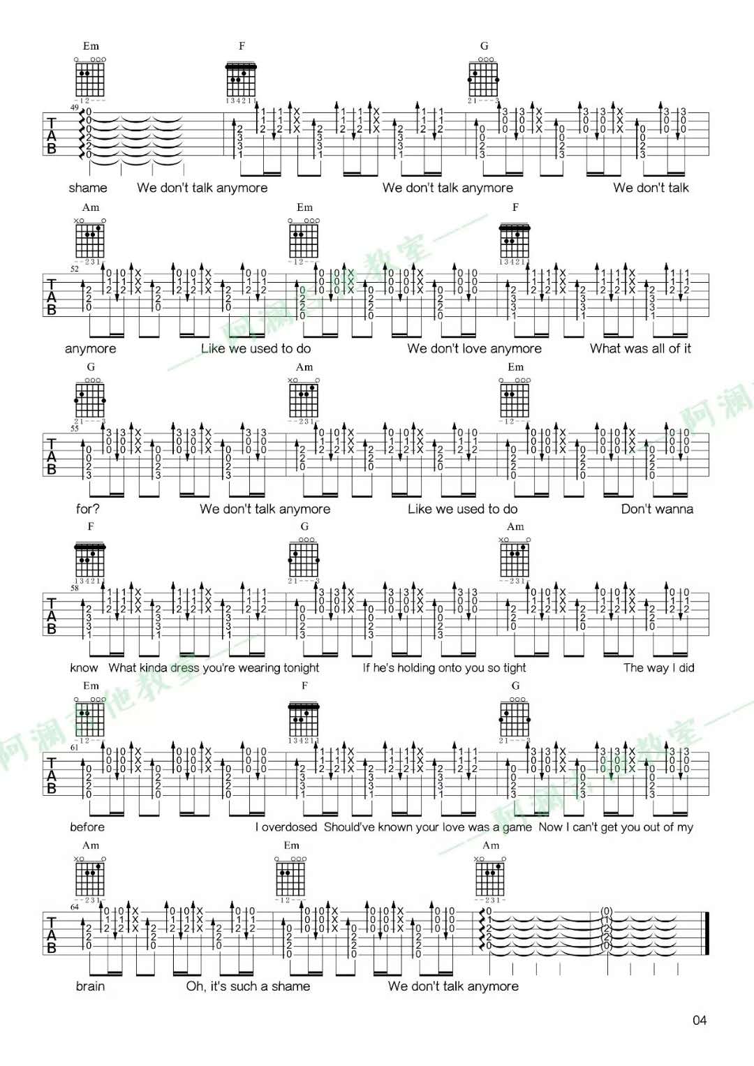 《《We Dont Talk Anymore吉他谱》(F调)》内容来自于互联网,不能保证内容的准确性与完整性,仅供学习交流欣赏,请勿用于其它用途,内容版权归原作者及来源网站所有,如有侵犯到您的权益请来信告知,我们将及时删除。