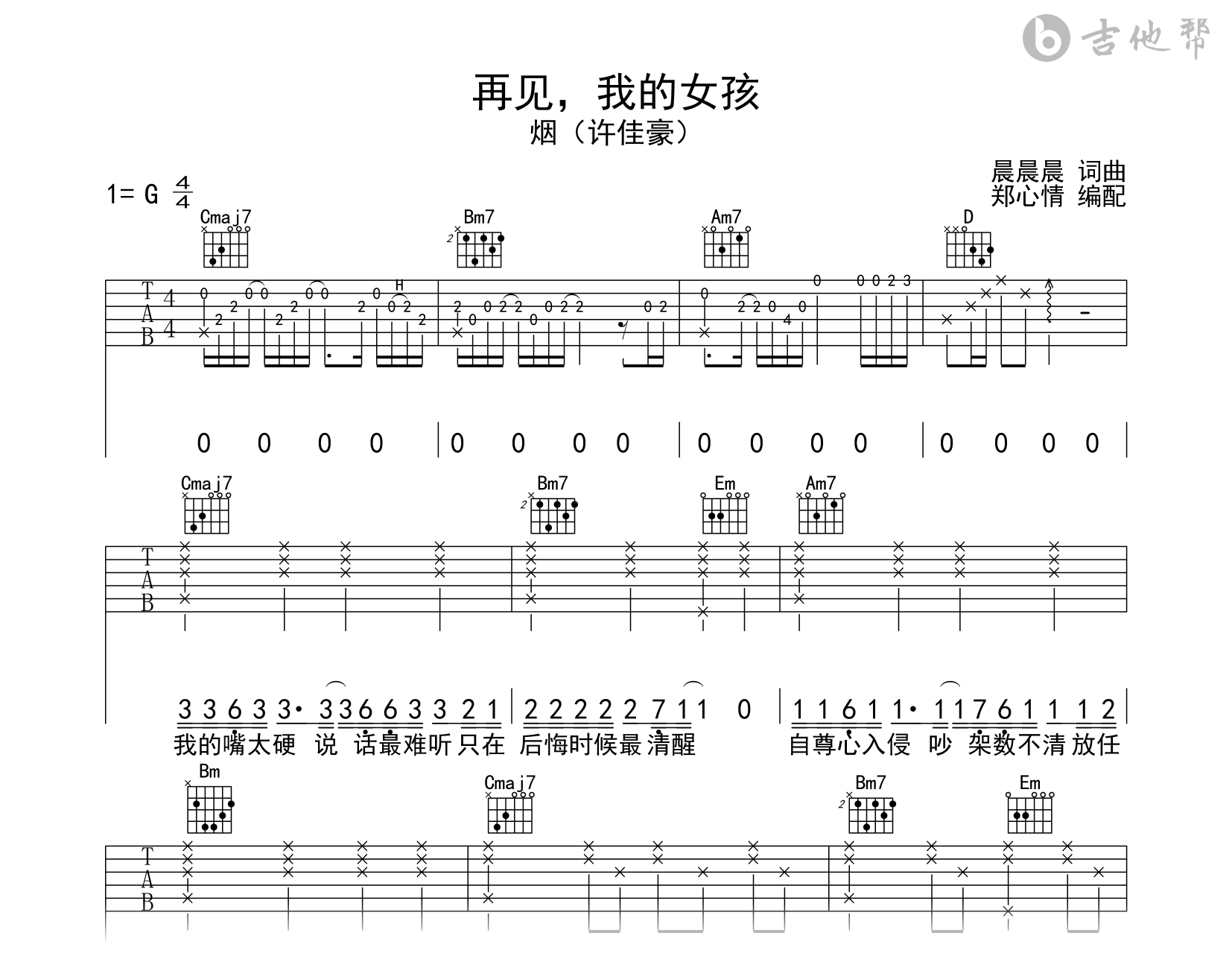 《烟(许佳豪)《再见我的女孩吉他谱》(G调)》内容来自于互联网,不能保证内容的准确性与完整性,仅供学习交流欣赏,请勿用于其它用途,内容版权归原作者及来源网站所有,如有侵犯到您的权益请来信告知,我们将及时删除。