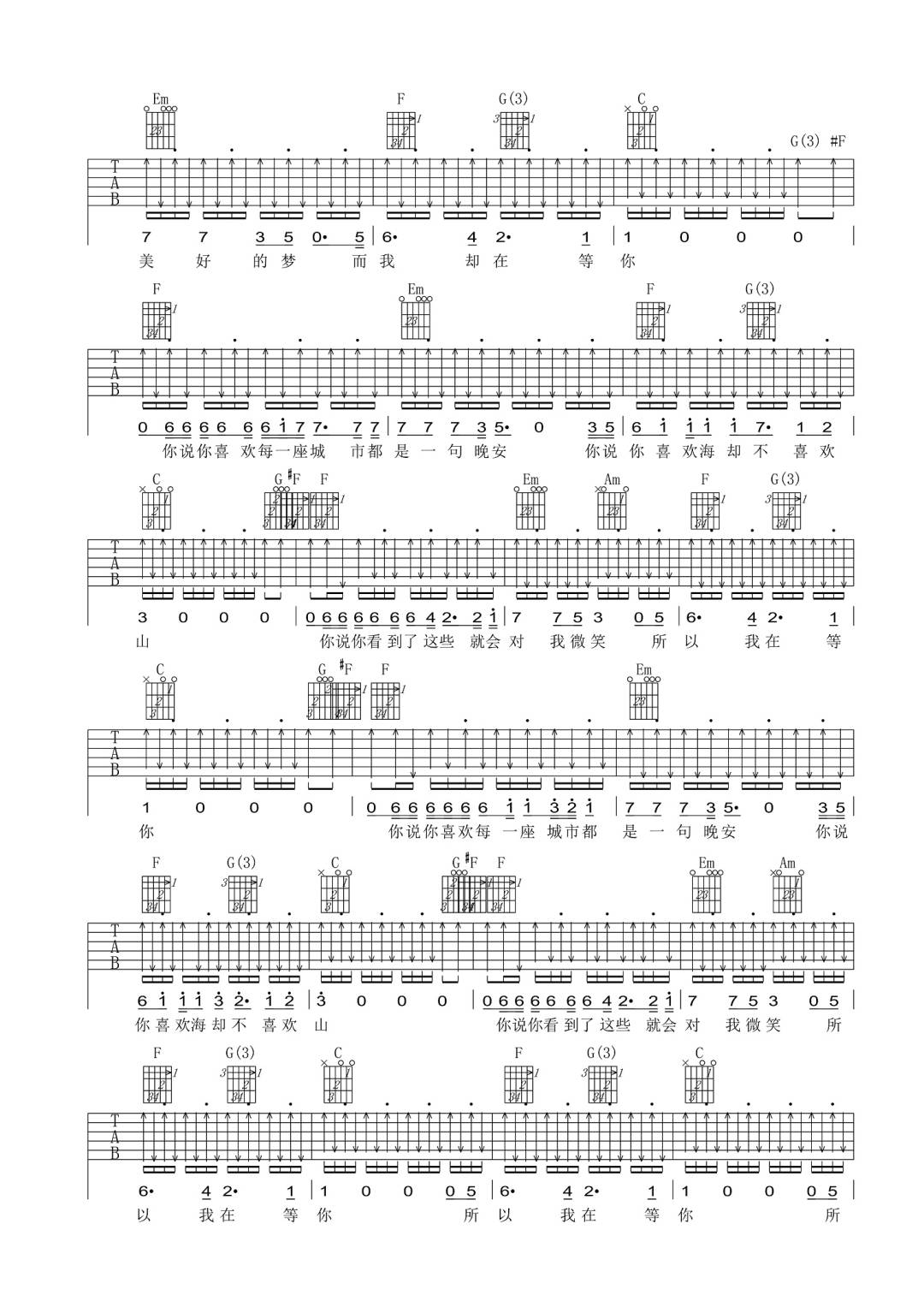 《鹿先森乐队《你喜欢海却不喜欢山吉他谱》(C调)》内容来自于互联网,不能保证内容的准确性与完整性,仅供学习交流欣赏,请勿用于其它用途,内容版权归原作者及来源网站所有,如有侵犯到您的权益请来信告知,我们将及时删除。