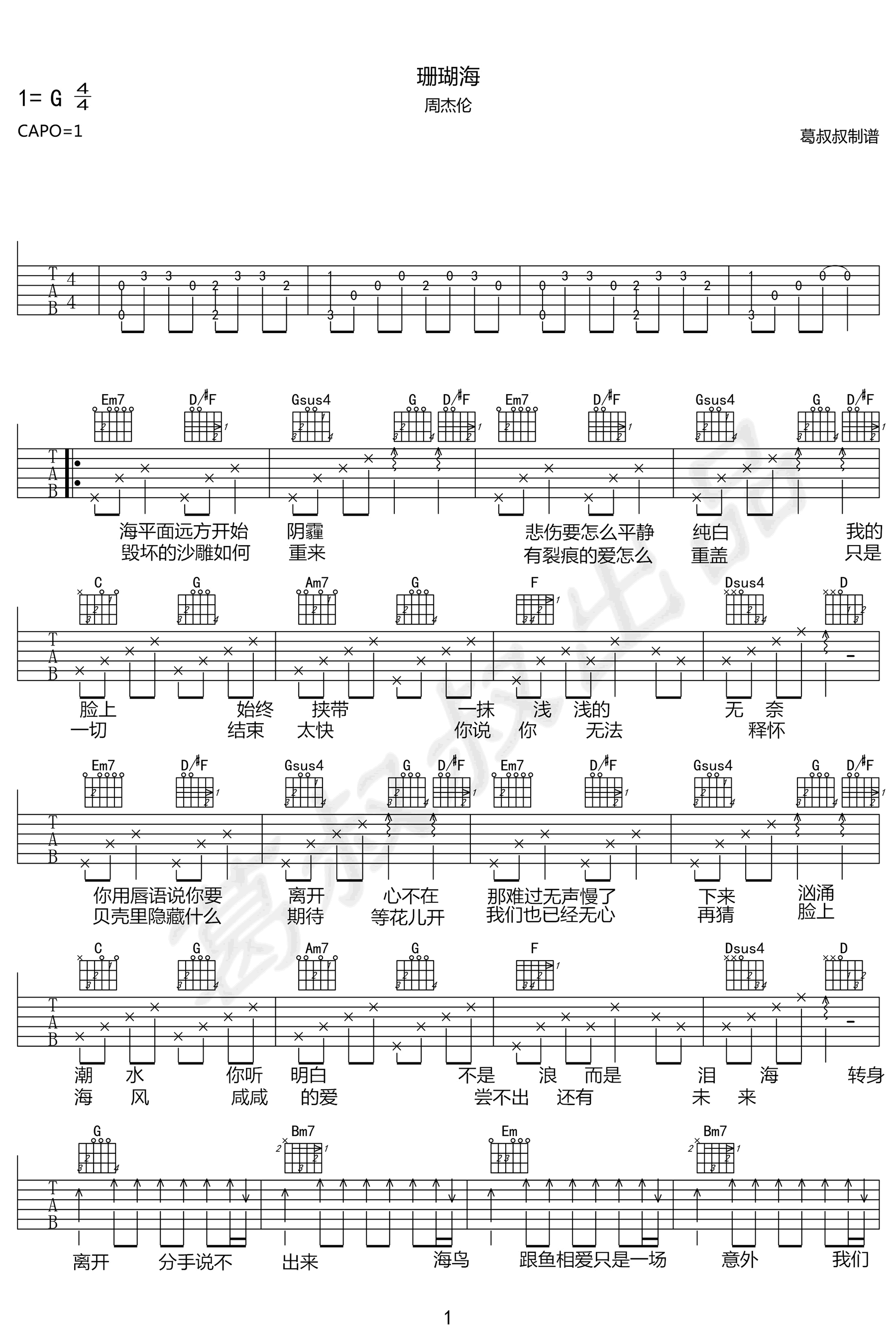 "珊瑚海"吉他谱,是周杰伦演唱的一首动人歌曲,采用4/4拍的节奏,原调为降A调,但曲谱采用G调指法编配。演唱时,可使用变调夹1品恢复到原调,或根据个人嗓音情况自行选择。这份曲谱由酷琴谱提供,包括两张高清图片,可供吉他手学习演奏。这首歌的MV讲述了一段深刻的爱情