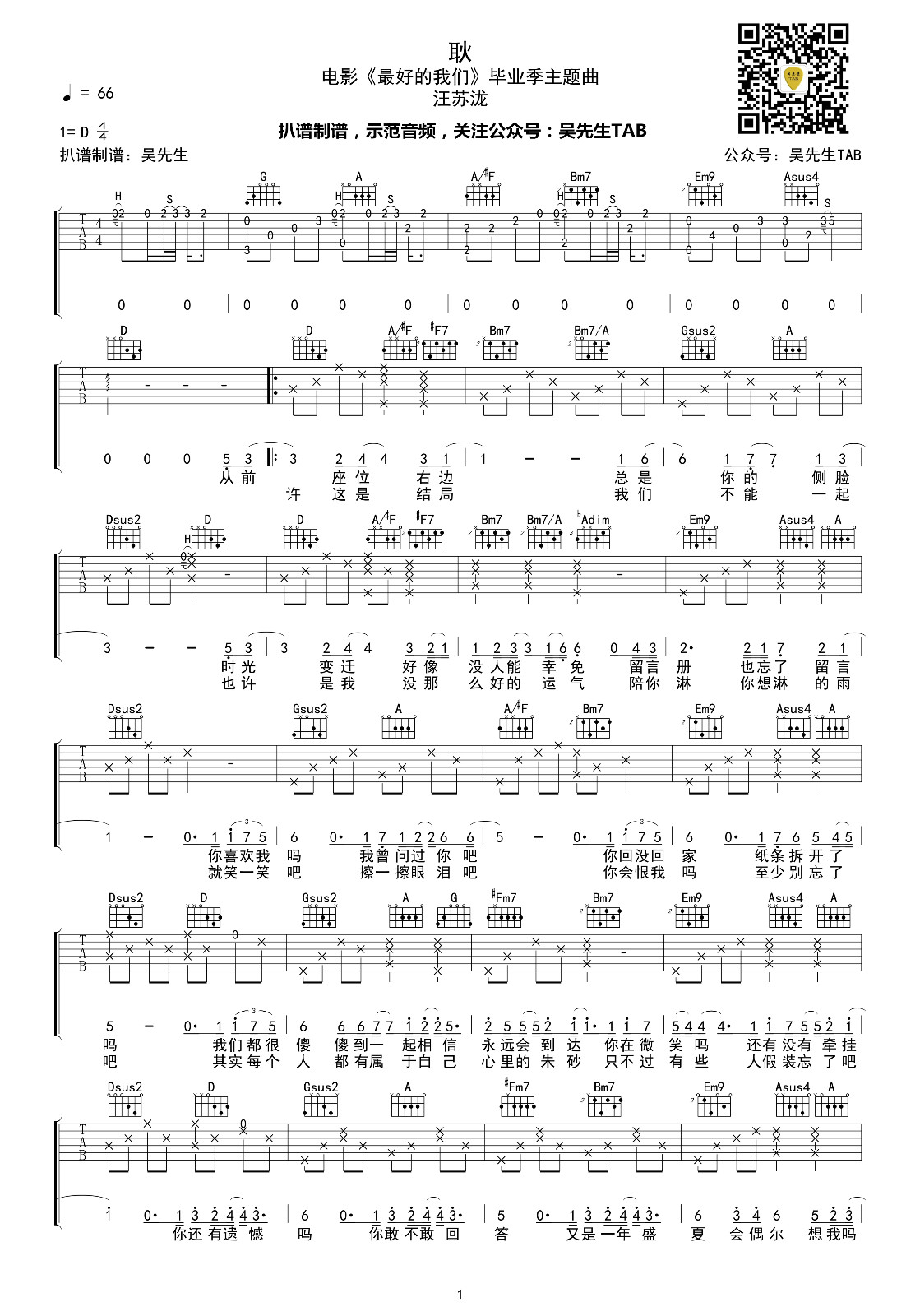 《汪苏泷《耿吉他谱》(D调)》内容来自于互联网,不能保证内容的准确性与完整性,仅供学习交流欣赏,请勿用于其它用途,内容版权归原作者及来源网站所有,如有侵犯到您的权益请来信告知,我们将及时删除。