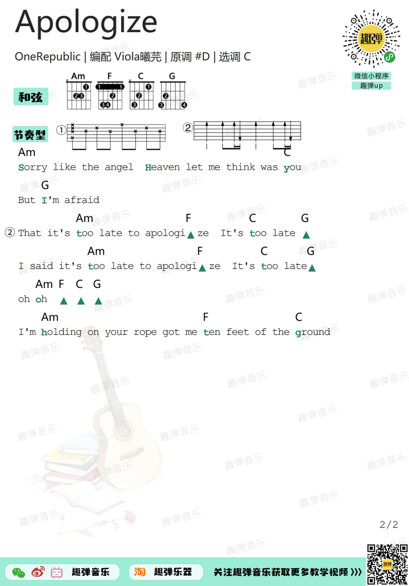 《《Apologize吉他谱》(C调)》内容来自于互联网,不能保证内容的准确性与完整性,仅供学习交流欣赏,请勿用于其它用途,内容版权归原作者及来源网站所有,如有侵犯到您的权益请来信告知,我们将及时删除。