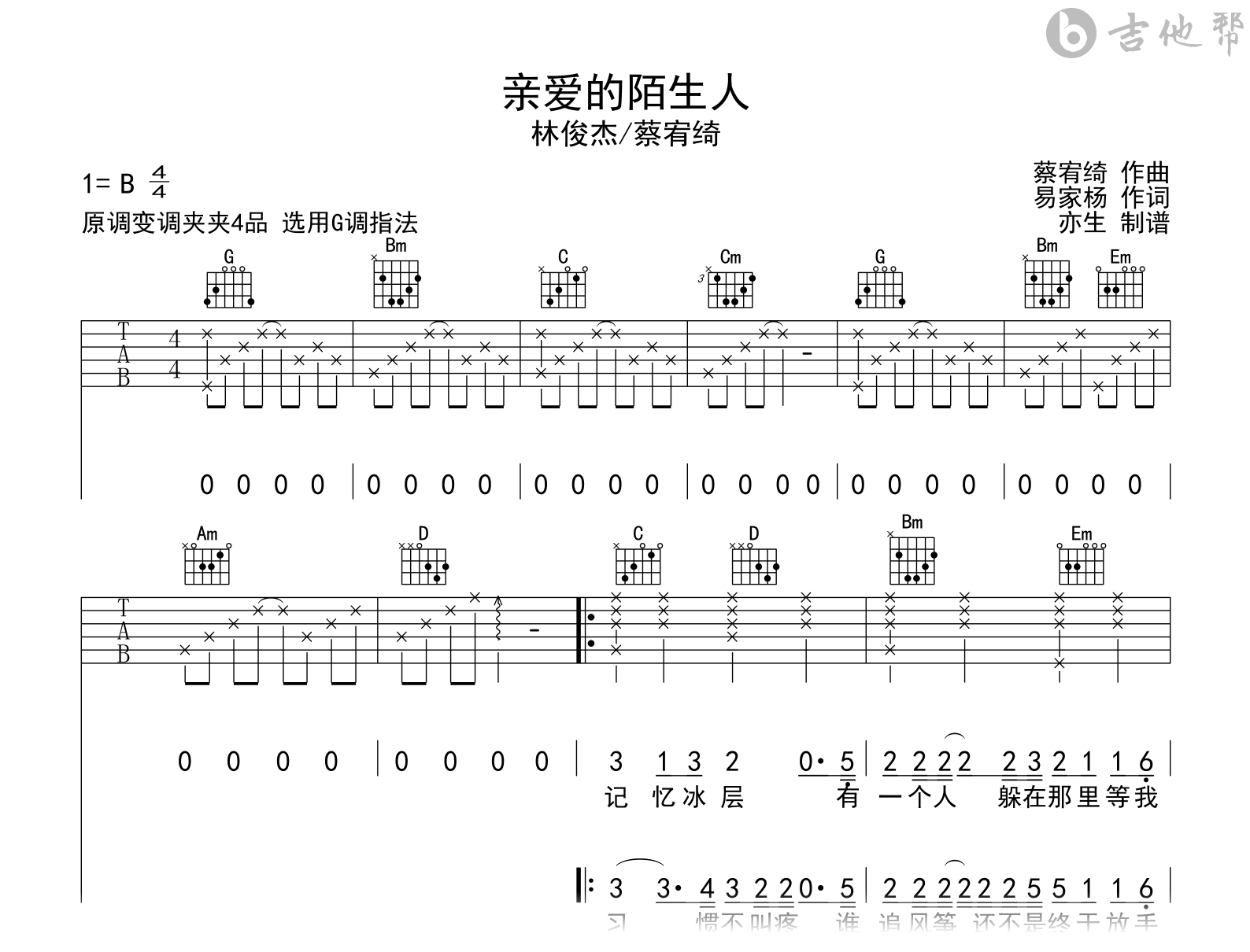 林俊杰《亲爱的陌生人吉他谱》(G调)