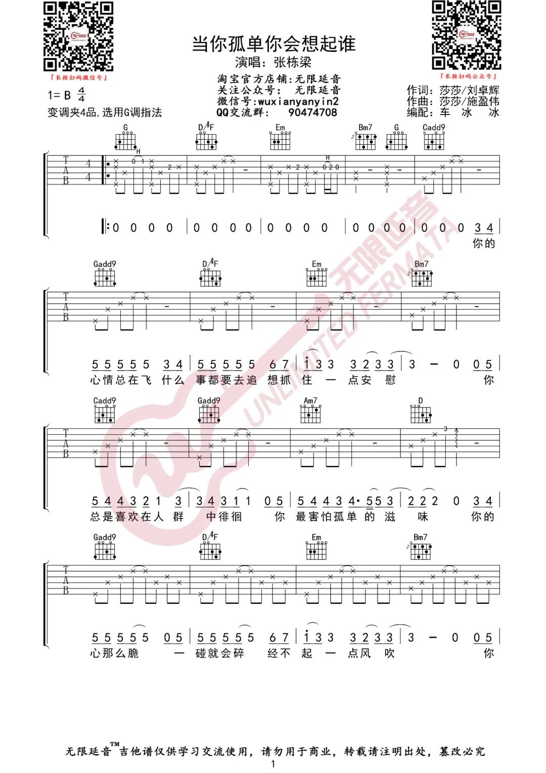 《张栋梁《当你孤单你会想起谁吉他谱》(G调)》内容来自于互联网,不能保证内容的准确性与完整性,仅供学习交流欣赏,请勿用于其它用途,内容版权归原作者及来源网站所有,如有侵犯到您的权益请来信告知,我们将及时删除。