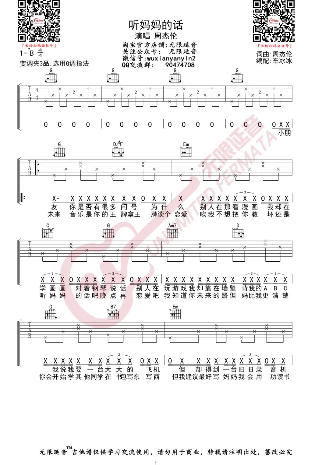 《周杰伦《听妈妈的话吉他谱》(G调)》内容来自于互联网,不能保证内容的准确性与完整性,仅供学习交流欣赏,请勿用于其它用途,内容版权归原作者及来源网站所有,如有侵犯到您的权益请来信告知,我们将及时删除。