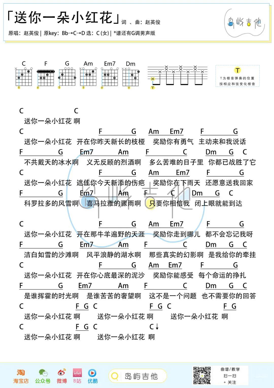 《易烊千玺《送你一朵小红花吉他谱》(G调)》内容来自于互联网,不能保证内容的准确性与完整性,仅供学习交流欣赏,请勿用于其它用途,内容版权归原作者及来源网站所有,如有侵犯到您的权益请来信告知,我们将及时删除。