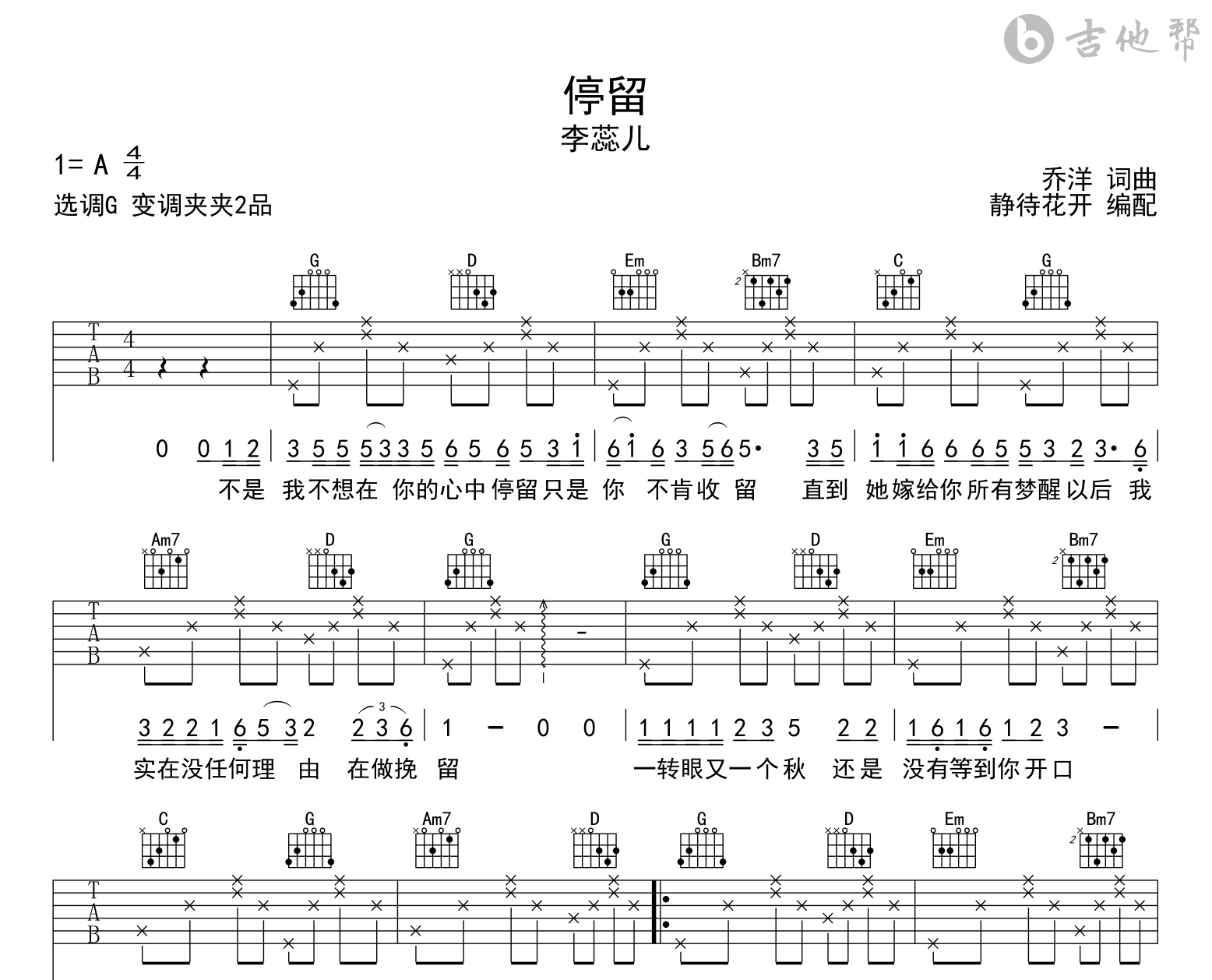 《李蕊儿《停留吉他谱》(G调)》内容来自于互联网,不能保证内容的准确性与完整性,仅供学习交流欣赏,请勿用于其它用途,内容版权归原作者及来源网站所有,如有侵犯到您的权益请来信告知,我们将及时删除。