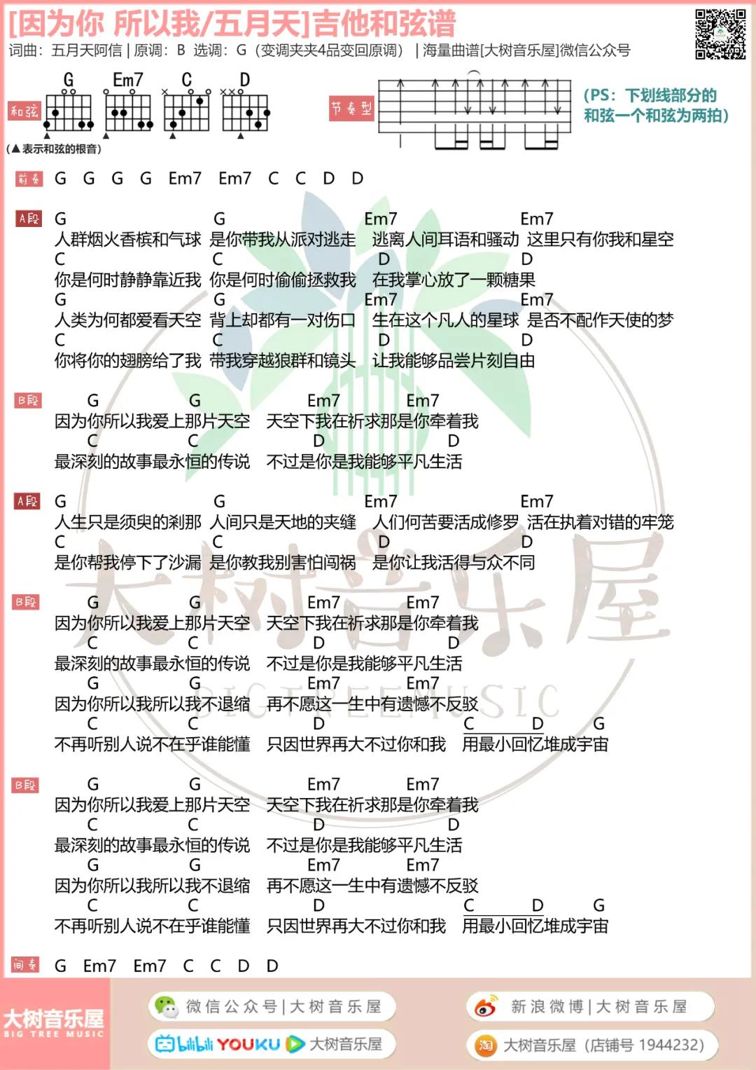 《五月天《因为你所以我吉他谱》(G调)》内容来自于互联网,不能保证内容的准确性与完整性,仅供学习交流欣赏,请勿用于其它用途,内容版权归原作者及来源网站所有,如有侵犯到您的权益请来信告知,我们将及时删除。