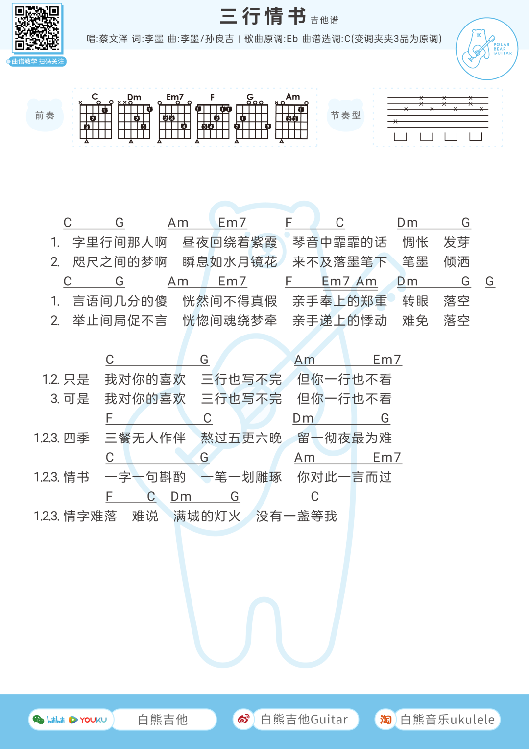 《蔡文泽倾情《三行情书吉他谱》(C调)》内容来自于互联网,不能保证内容的准确性与完整性,仅供学习交流欣赏,请勿用于其它用途,内容版权归原作者及来源网站所有,如有侵犯到您的权益请来信告知,我们将及时删除。