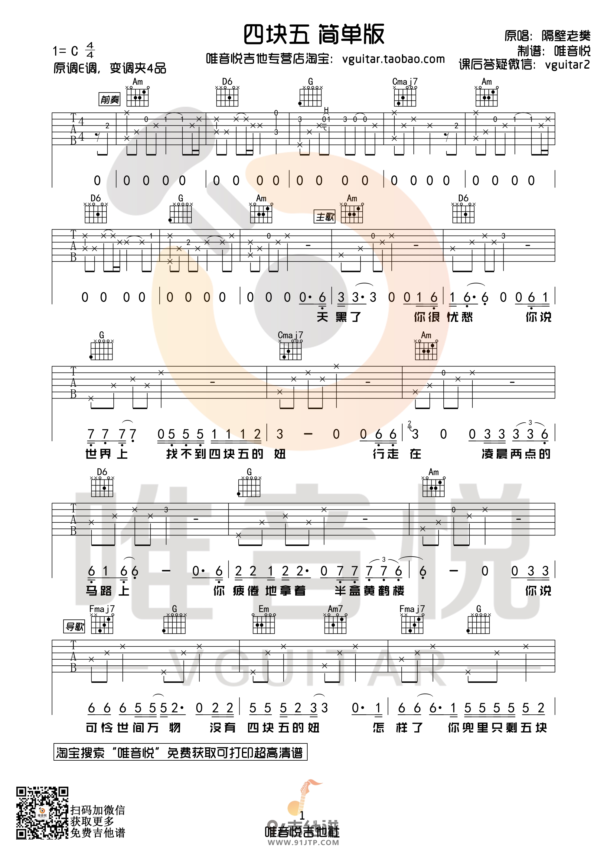 《隔壁老樊《四块五吉他谱》(C调)》内容来自于互联网,不能保证内容的准确性与完整性,仅供学习交流欣赏,请勿用于其它用途,内容版权归原作者及来源网站所有,如有侵犯到您的权益请来信告知,我们将及时删除。