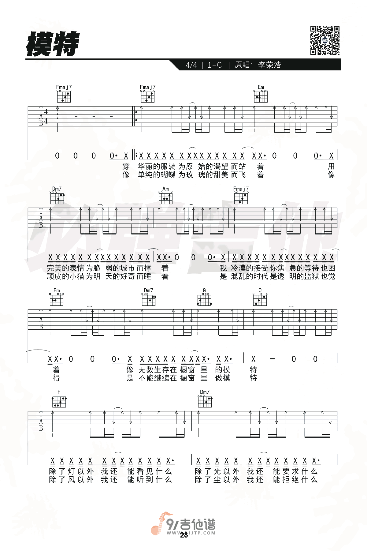 《李荣浩《模特吉他谱》(C调)》内容来自于互联网,不能保证内容的准确性与完整性,仅供学习交流欣赏,请勿用于其它用途,内容版权归原作者及来源网站所有,如有侵犯到您的权益请来信告知,我们将及时删除。