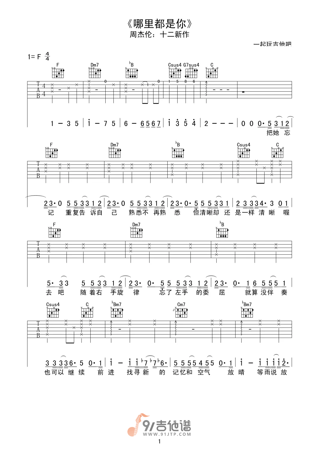 《周杰伦《哪里都是你吉他谱》(F调)》内容来自于互联网,不能保证内容的准确性与完整性,仅供学习交流欣赏,请勿用于其它用途,内容版权归原作者及来源网站所有,如有侵犯到您的权益请来信告知,我们将及时删除。