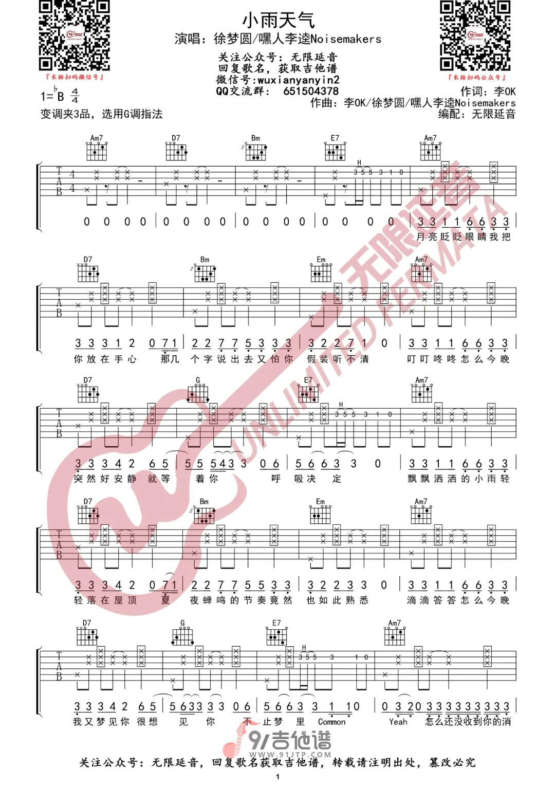 《嘿人李逵Noisemakers《小雨天气吉他谱》(G调)》内容来自于互联网,不能保证内容的准确性与完整性,仅供学习交流欣赏,请勿用于其它用途,内容版权归原作者及来源网站所有,如有侵犯到您的权益请来信告知,我们将及时删除。