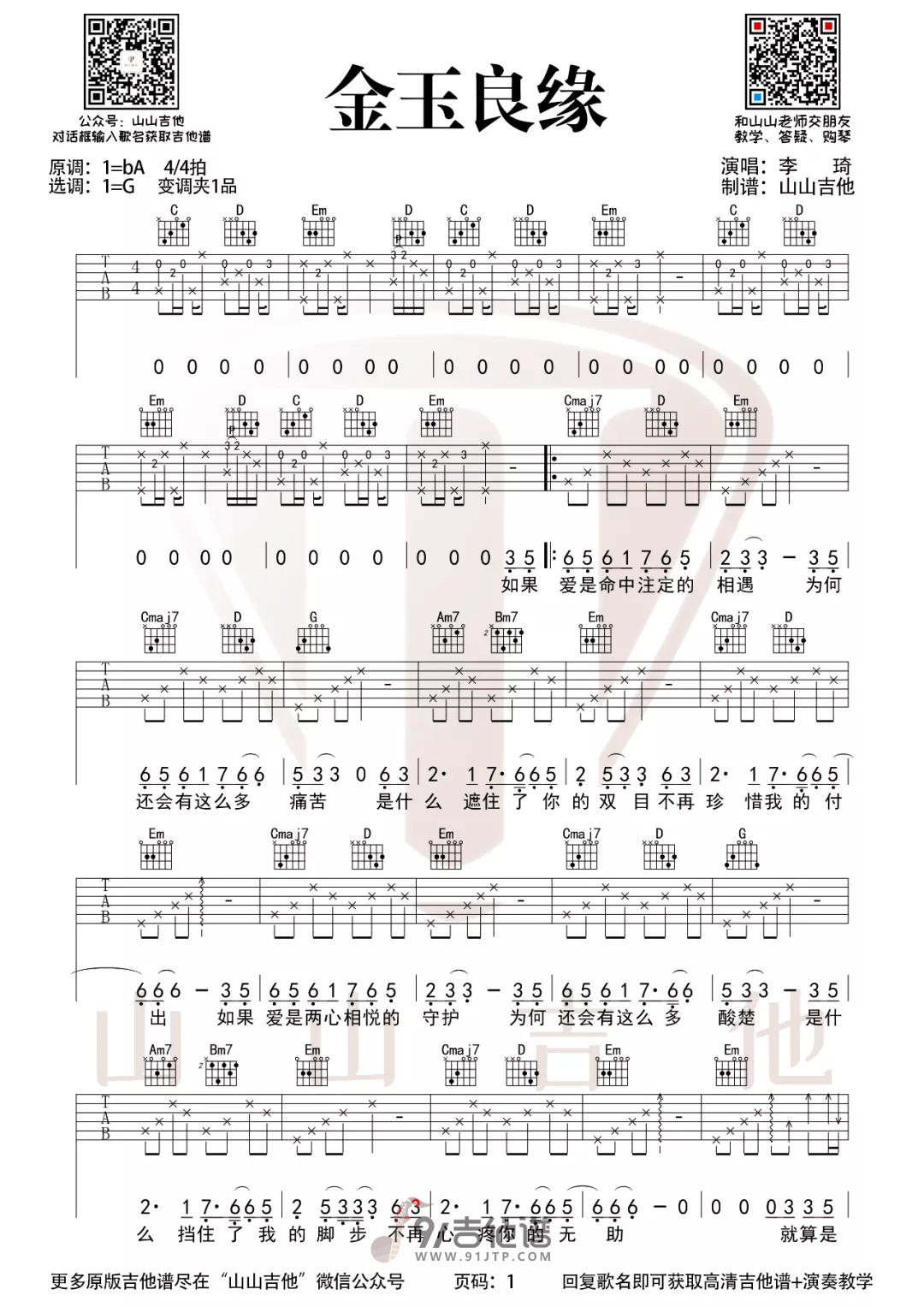 《李琦《金玉良缘吉他谱》(G调)》内容来自于互联网,不能保证内容的准确性与完整性,仅供学习交流欣赏,请勿用于其它用途,内容版权归原作者及来源网站所有,如有侵犯到您的权益请来信告知,我们将及时删除。