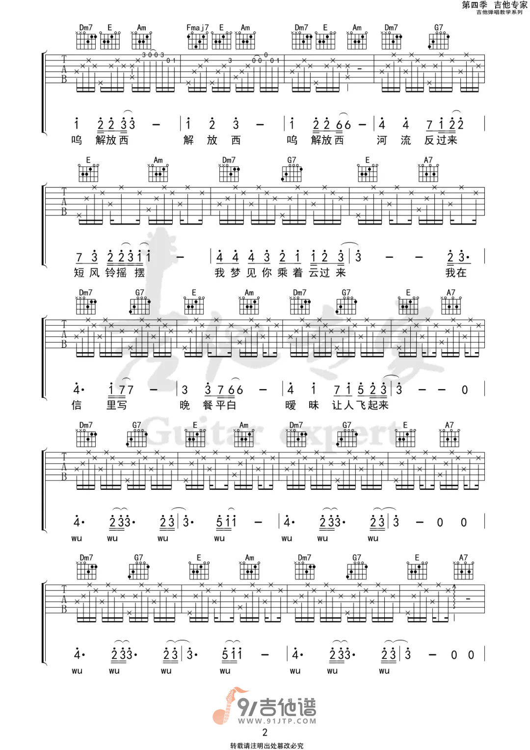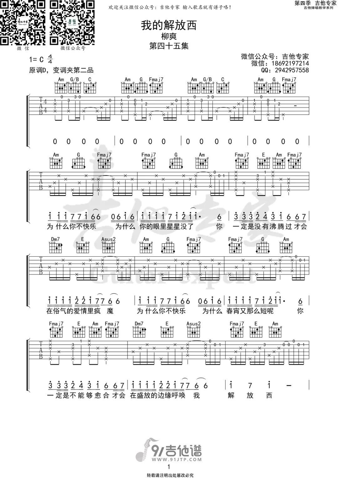 《柳爽《我的解放西吉他谱》(C调)》内容来自于互联网,不能保证内容的准确性与完整性,仅供学习交流欣赏,请勿用于其它用途,内容版权归原作者及来源网站所有,如有侵犯到您的权益请来信告知,我们将及时删除。