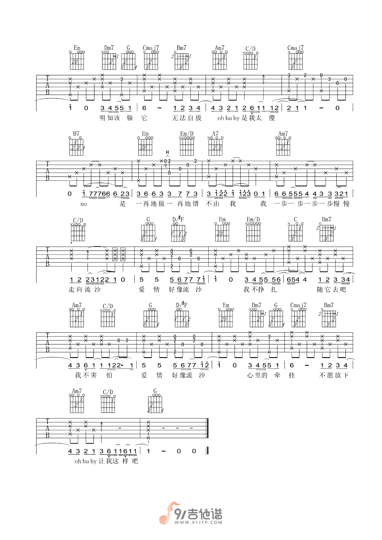 《陶喆《流沙吉他谱》(G调)》内容来自于互联网,不能保证内容的准确性与完整性,仅供学习交流欣赏,请勿用于其它用途,内容版权归原作者及来源网站所有,如有侵犯到您的权益请来信告知,我们将及时删除。