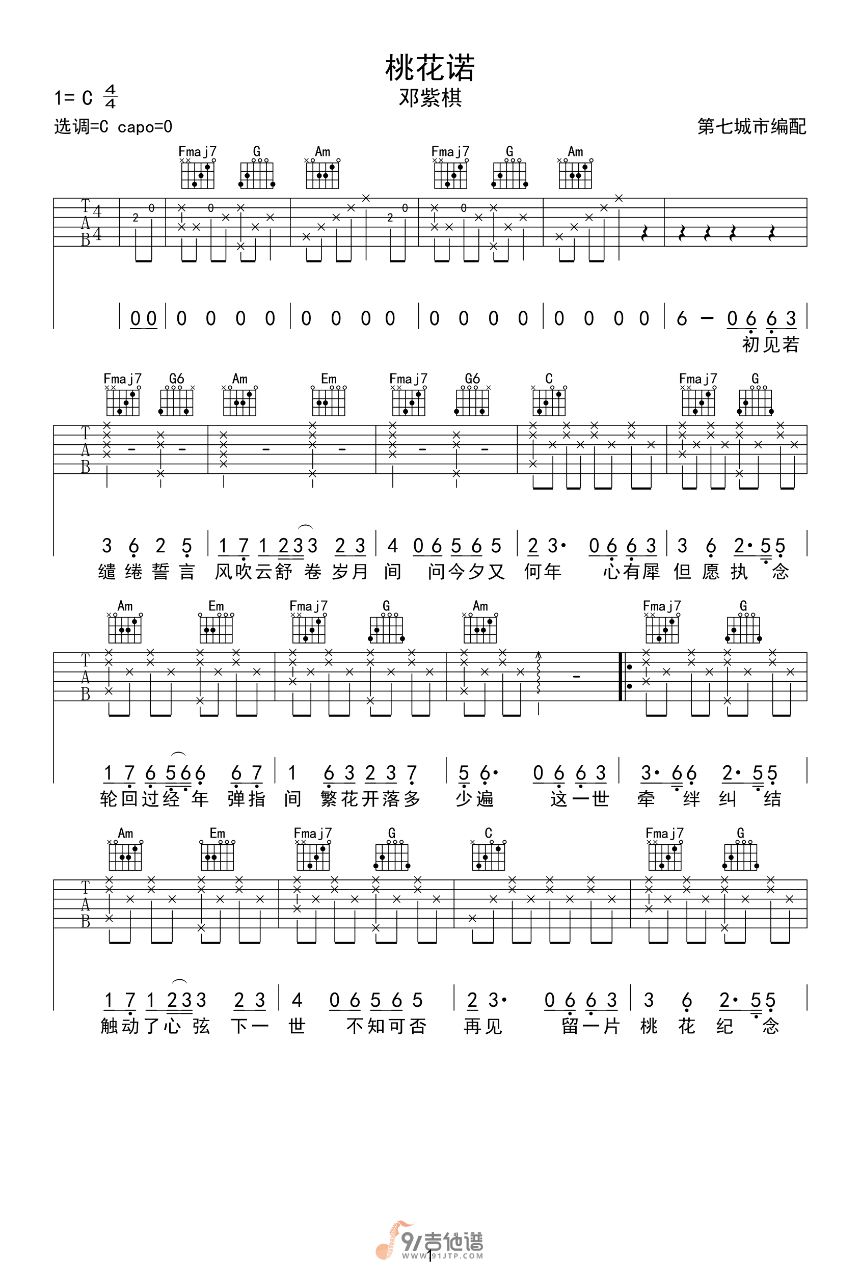 《邓紫棋《桃花诺吉他谱》(C调)》内容来自于互联网,不能保证内容的准确性与完整性,仅供学习交流欣赏,请勿用于其它用途,内容版权归原作者及来源网站所有,如有侵犯到您的权益请来信告知,我们将及时删除。
