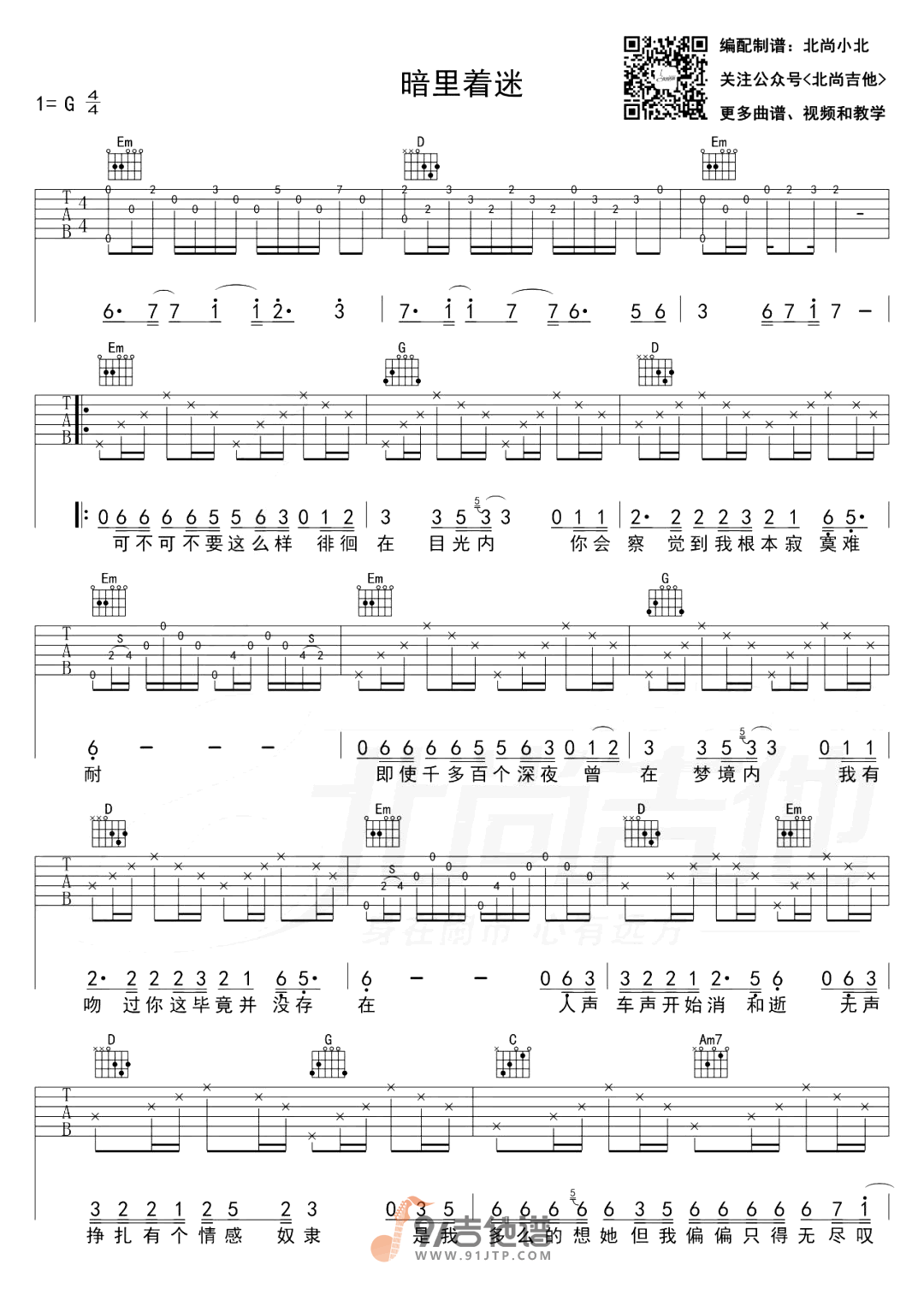 《暗里着迷》吉他曲谱,演唱者刘德华,采用4/4拍节奏,以G调指法编排。原调为降E,演唱时可使用变调夹。这首歌对刘德华而言,承载了半生中极为珍贵的情感,歌词流露出深刻的默默爱恋之情。由北尚吉他精心编排。