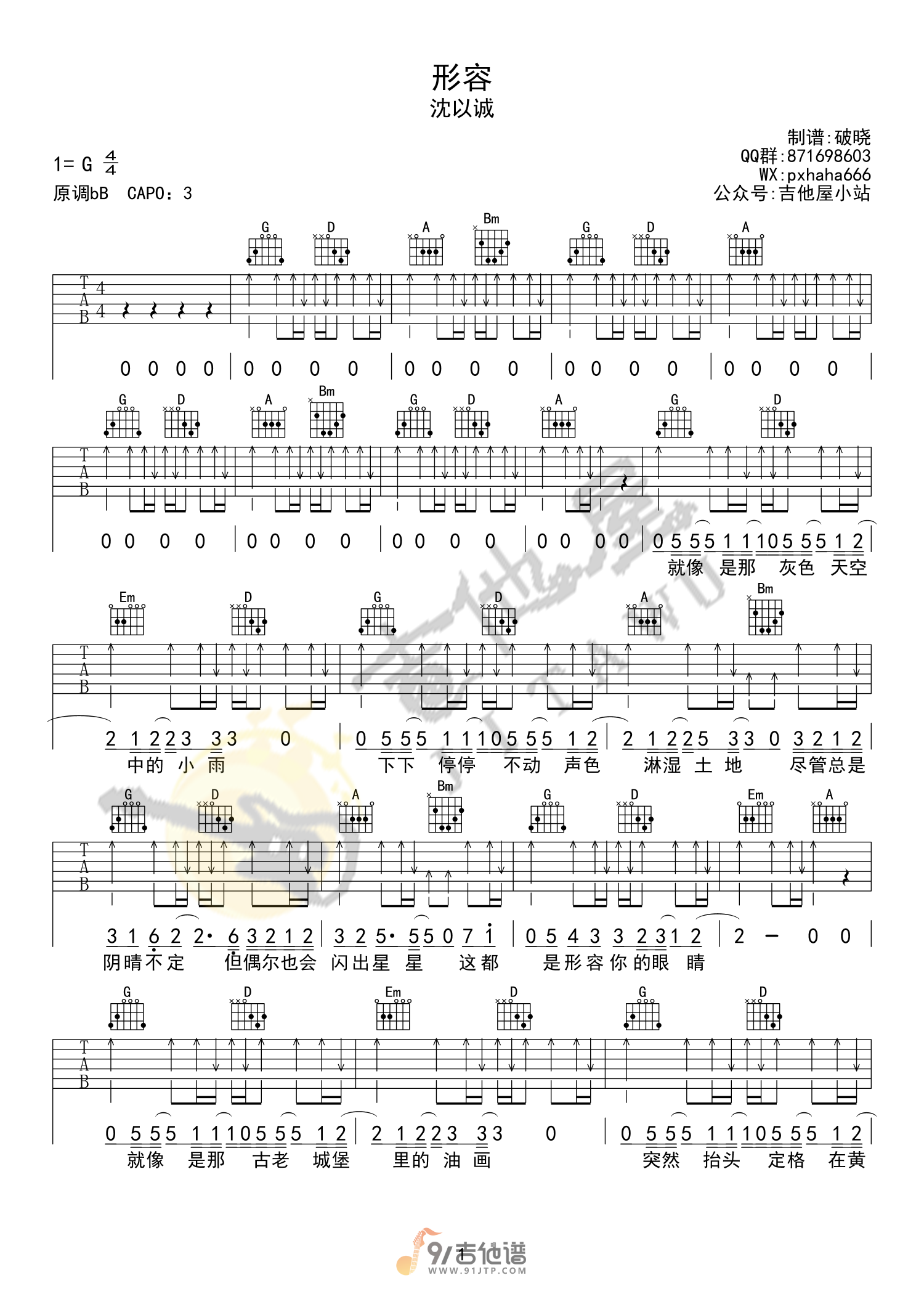 沈以诚《形容吉他谱》(G调)