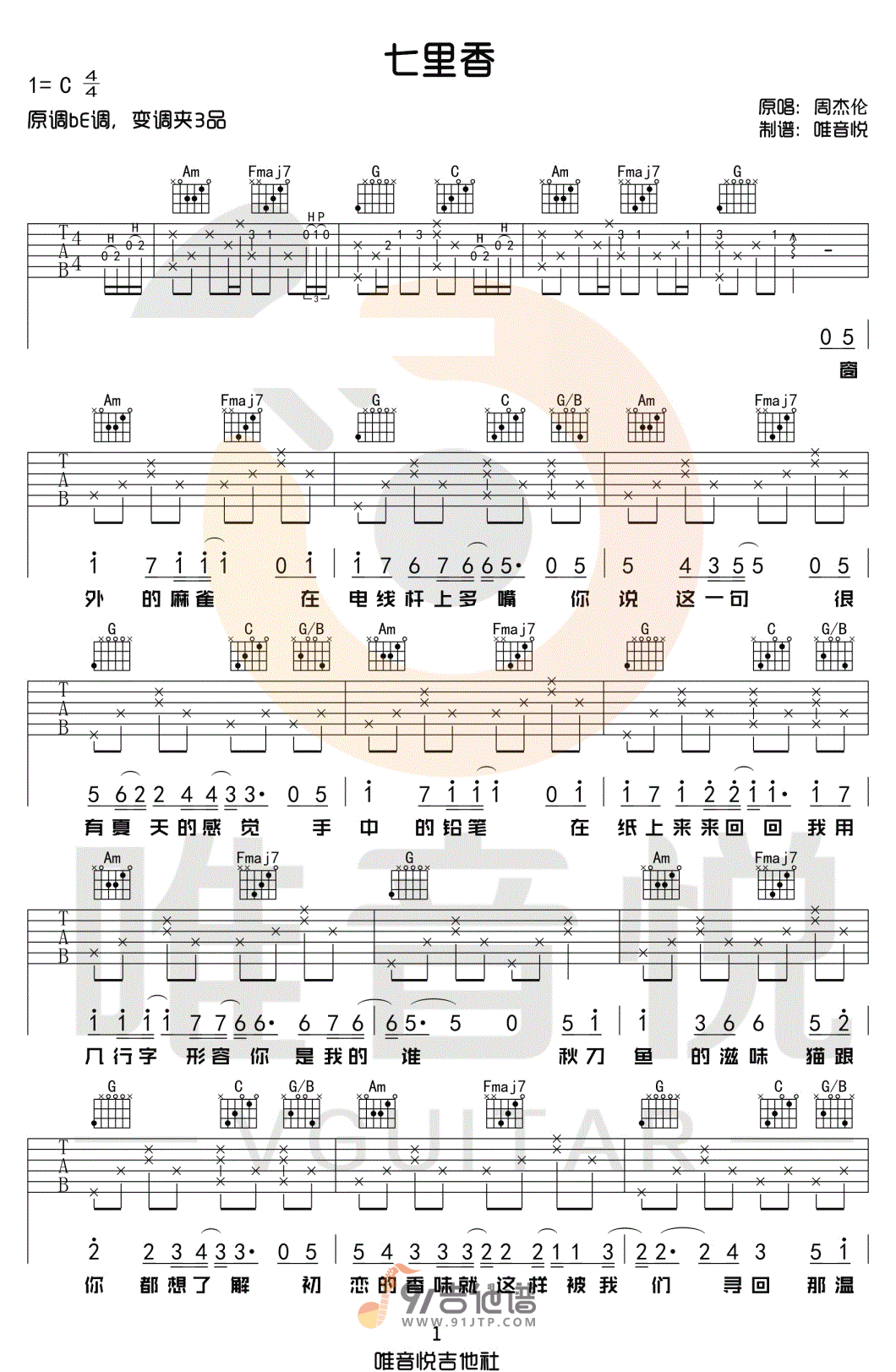 《七里香》吉他谱是周杰伦演唱的经典曲目,以4/4拍节奏为基础,原调为降E调,现采用C调指法编配。演唱时,可夹3品变调或根据嗓音情况调整。这份曲谱由唯音悦编制,勾起80、90后学生时代的珍贵回忆。当年,MP3和MP4刚开始流行,有些人甚至用磁带来欣赏音乐。这首歌