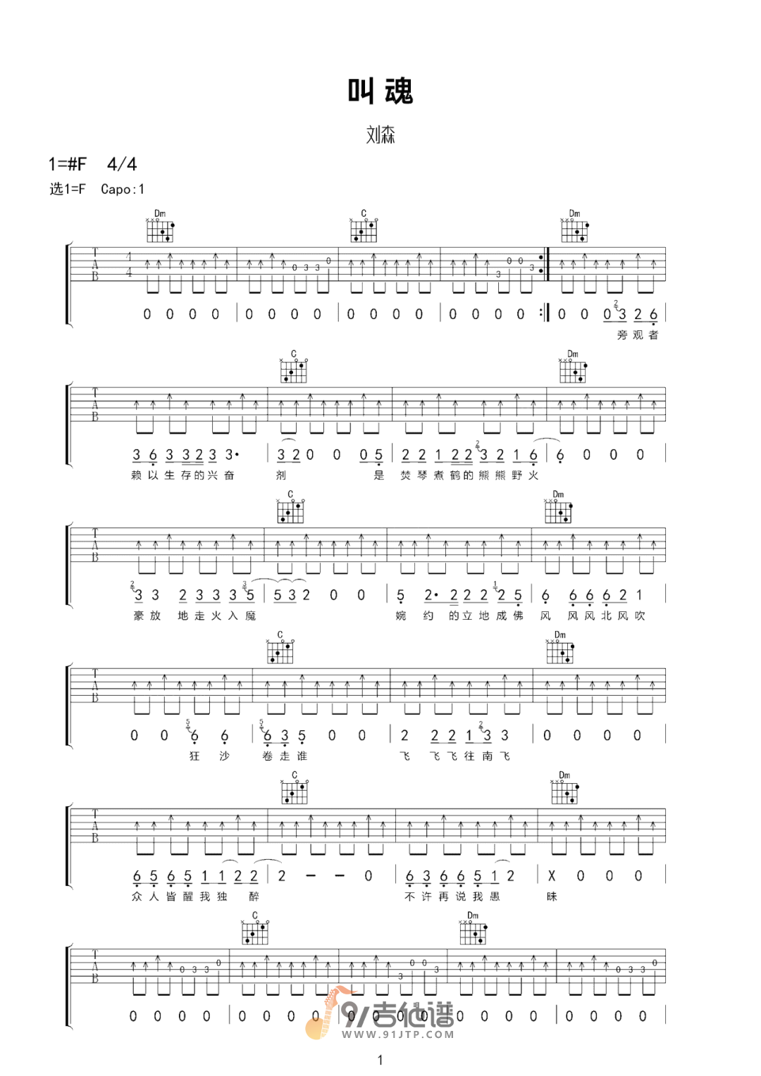 《刘森《叫魂吉他谱》(F调)》内容来自于互联网,不能保证内容的准确性与完整性,仅供学习交流欣赏,请勿用于其它用途,内容版权归原作者及来源网站所有,如有侵犯到您的权益请来信告知,我们将及时删除。