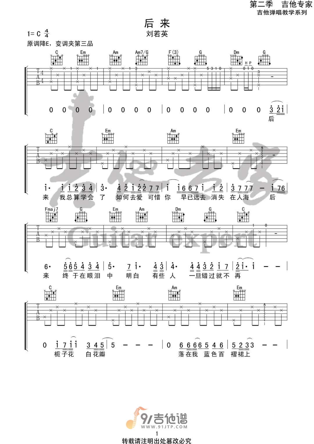 《刘若英《后来吉他谱》(C调)》内容来自于互联网,不能保证内容的准确性与完整性,仅供学习交流欣赏,请勿用于其它用途,内容版权归原作者及来源网站所有,如有侵犯到您的权益请来信告知,我们将及时删除。