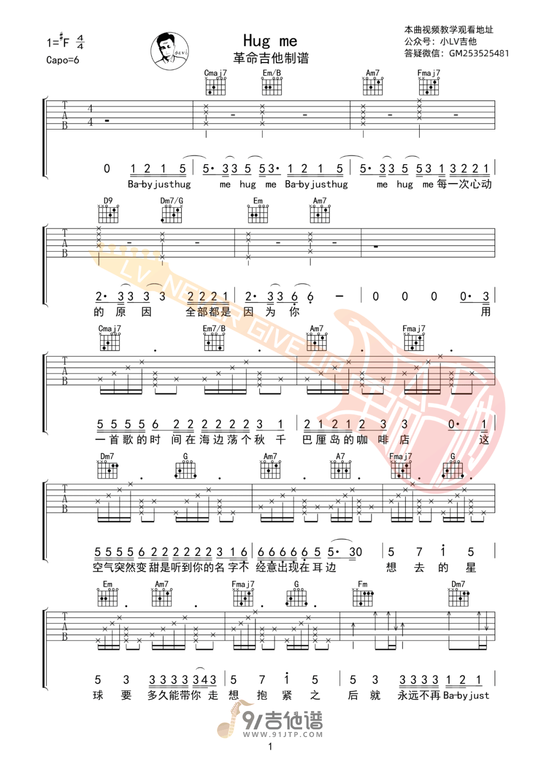 《蔡徐坤《Hug Me吉他谱》(C调)》内容来自于互联网,不能保证内容的准确性与完整性,仅供学习交流欣赏,请勿用于其它用途,内容版权归原作者及来源网站所有,如有侵犯到您的权益请来信告知,我们将及时删除。