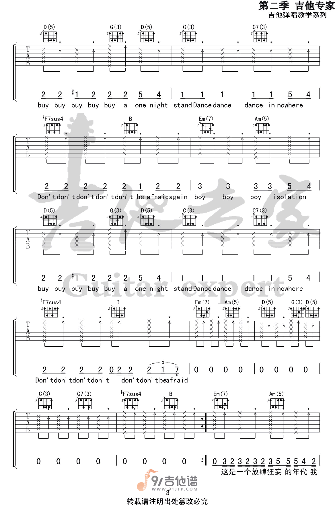 这是一首由海龟先生演唱的吉他曲目,名为《男孩别哭》。歌曲采用4/4拍的节奏,原调为G调,曲谱使用了G调指法编配而成,演唱时无需使用变调夹。歌曲描述了一个漂泊异乡的孤独男孩的心情,他在大城市中寻找一个属于自己的安身之地,渴望找到一个可以安放他热情悸动心灵的角落。