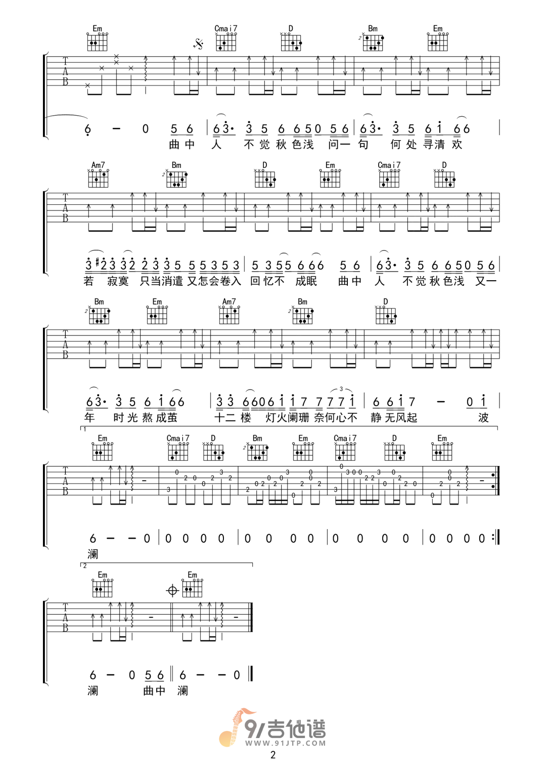 这是一首名为《不觉秋色浅》的吉他曲,原唱者是冬,节奏为4/4拍。曲谱采用了G调指法,可以夹变调夹2品回到原调,适合个人嗓音情况选择。歌词表达了内心的孤独和沉思,描述了人在寂静的夜晚中,面对回忆和孤独的困扰。曲中唱道:“人不觉秋色浅,问一句何处寻清欢,若寂寞只当