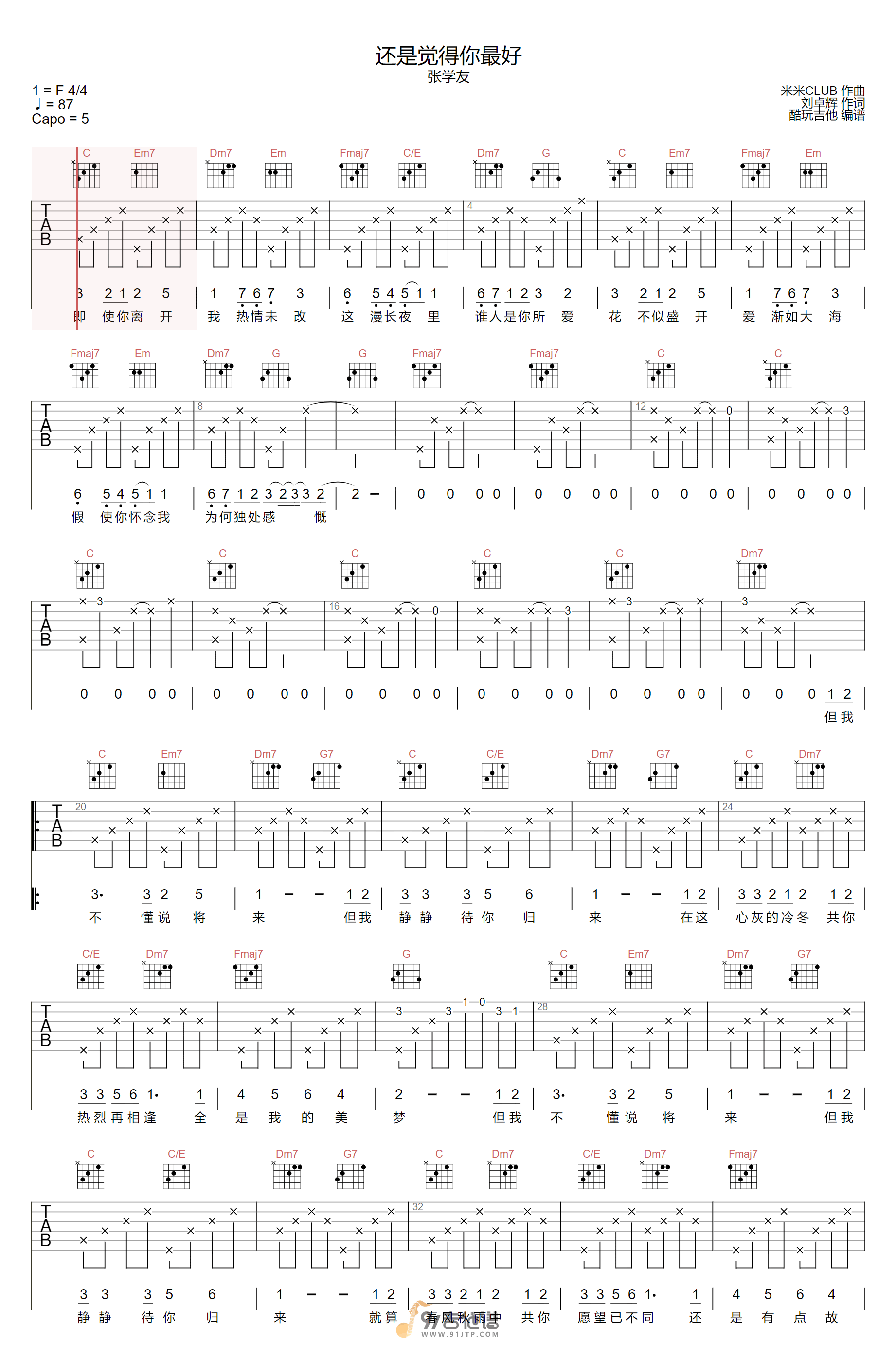 《张学友《还是觉得你最好吉他谱》(C调)》内容来自于互联网,不能保证内容的准确性与完整性,仅供学习交流欣赏,请勿用于其它用途,内容版权归原作者及来源网站所有,如有侵犯到您的权益请来信告知,我们将及时删除。