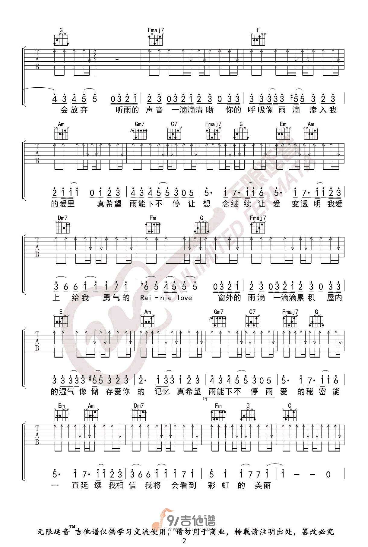 《杨丞琳《雨爱吉他谱》(C调)》内容来自于互联网,不能保证内容的准确性与完整性,仅供学习交流欣赏,请勿用于其它用途,内容版权归原作者及来源网站所有,如有侵犯到您的权益请来信告知,我们将及时删除。
