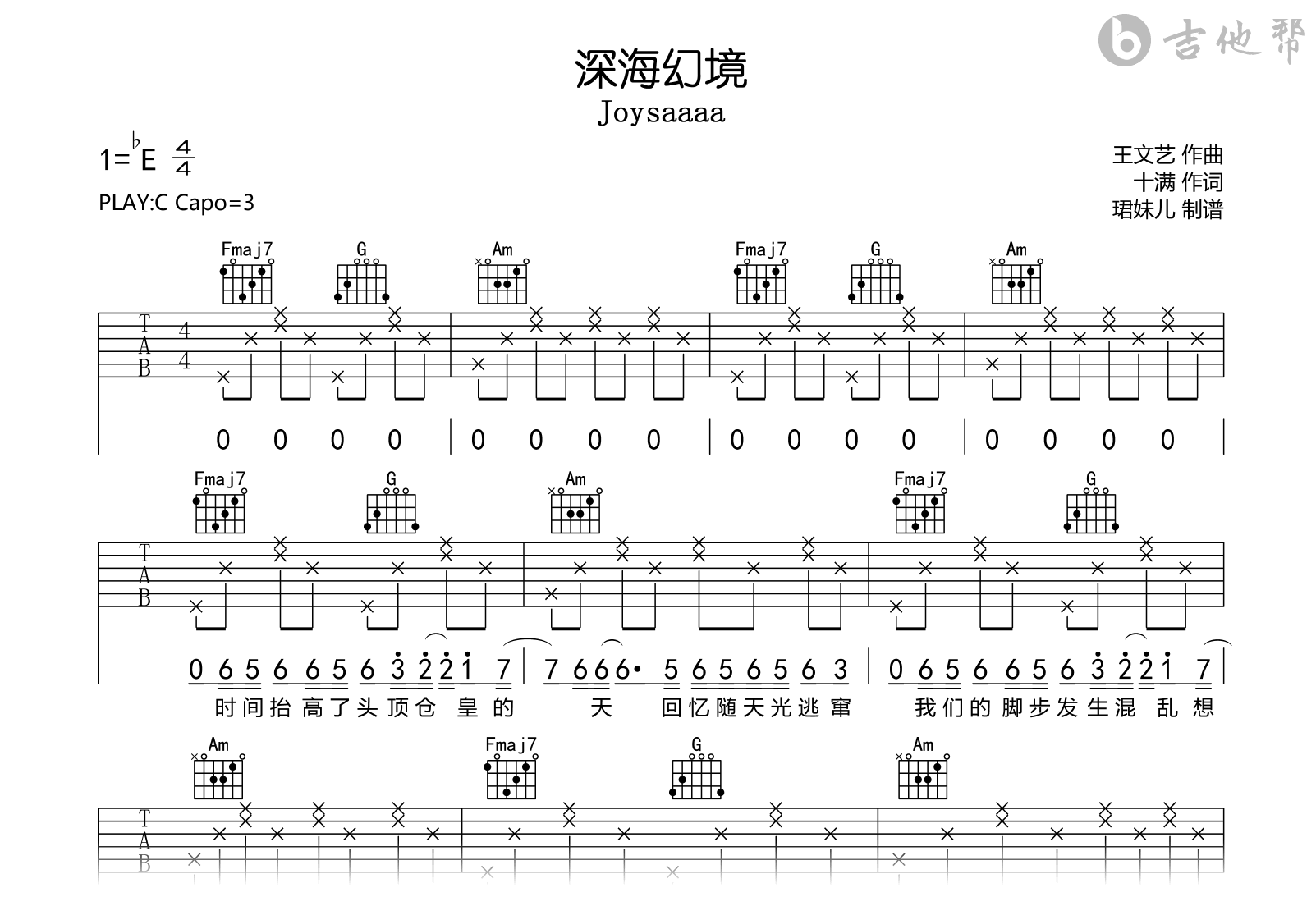 这首歌曲名为《深海幻境》,由Joysaaaa演唱。歌曲以深海般的宁静和空灵感为特点,让人仿佛置身于遗落的爱情记忆之中。吉他谱以降E调为基调,使用了G调的指法编排,建议在第3品位使用变调夹,演奏速度为每分钟85拍,非常适合初学者上手演奏。
