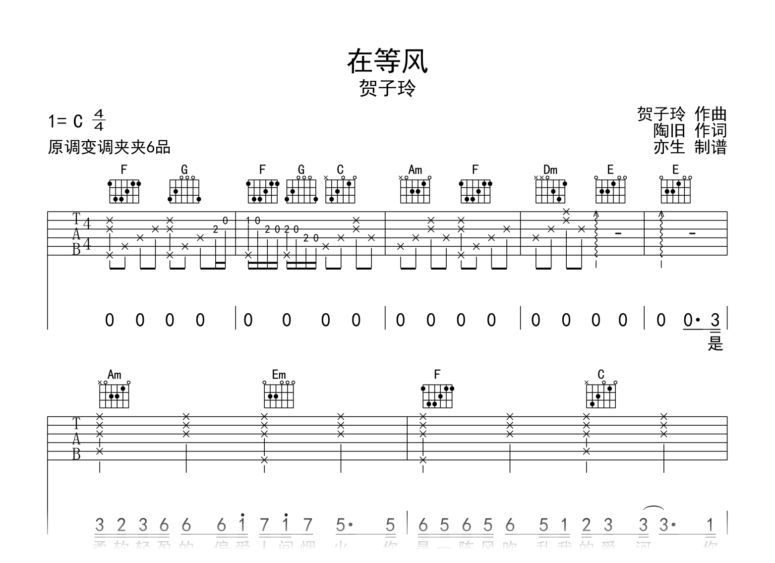 这首歌曲是《在等风》的吉他谱,由贺子玲演唱。谱子采用原调F,以C调和弦编配,演奏时使用变调夹夹在第6品。节奏为4/4拍,演奏速度约为每分钟95拍,难度较为简单。