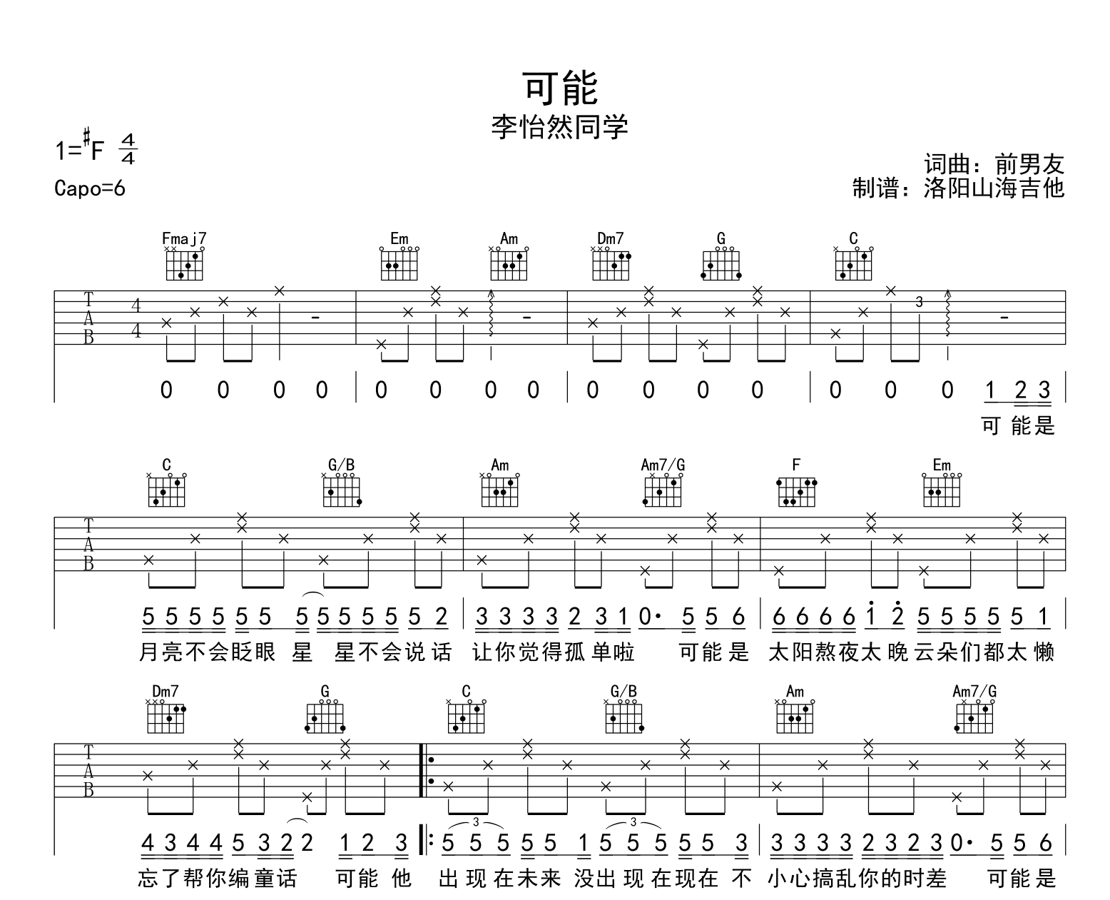 这是一首备受欢迎的网络歌曲《可能》的吉他谱,由李怡然同学编配。谱中采用了C调指法编排,原调升F,并配以Capo夹六品。吉他弹唱的谱子采用了六线谱,共有两张高清图片谱例。这份谱子是针对吉他的,让你能够用和弦轻松演奏这首流行歌曲。
