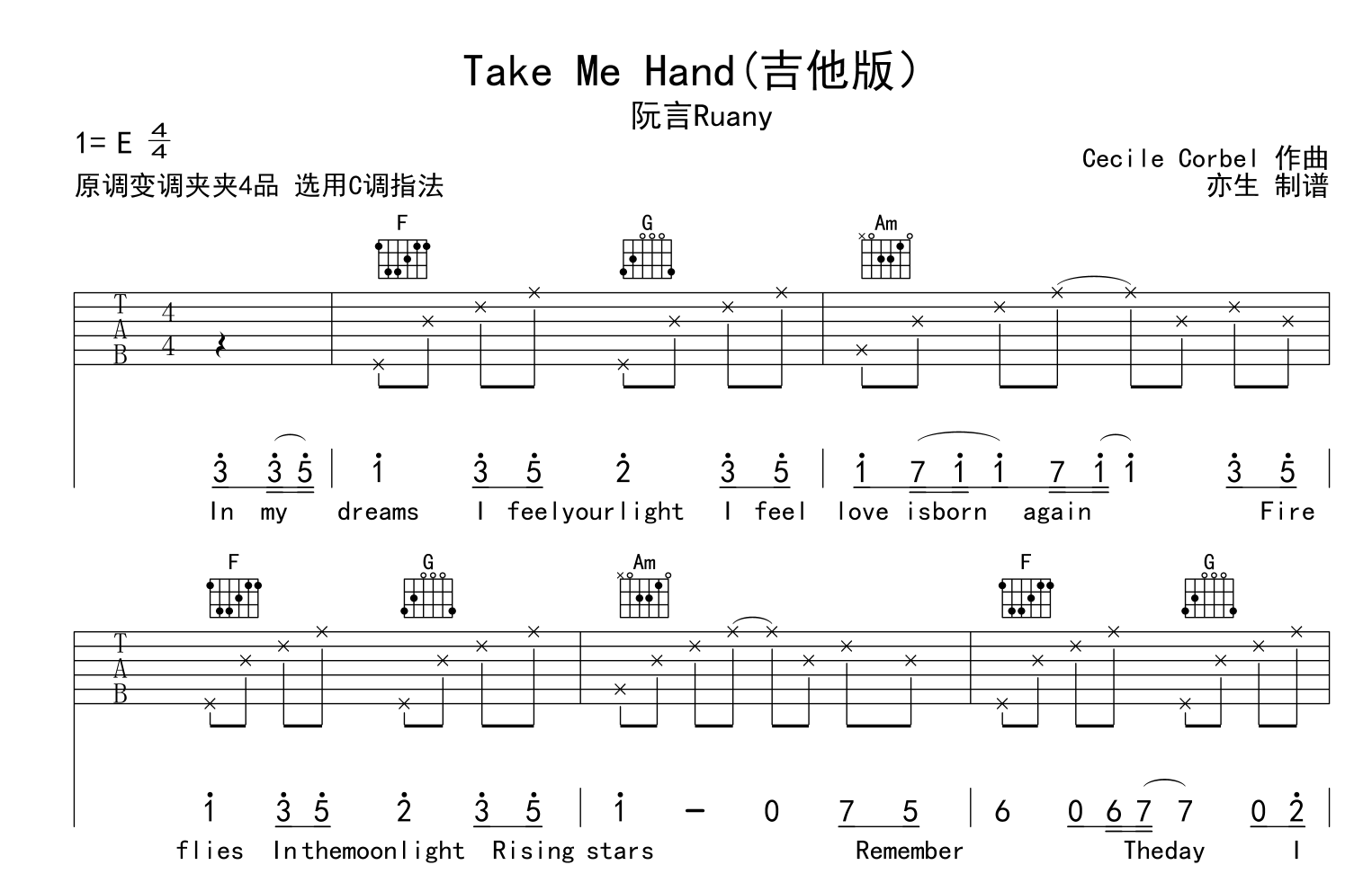 《阮言Ruany《Take Me Hand吉他谱》》内容来自于互联网,不能保证内容的准确性与完整性,仅供学习交流欣赏,请勿用于其它用途,内容版权归原作者及来源网站所有,如有侵犯到您的权益请来信告知,我们将及时删除。