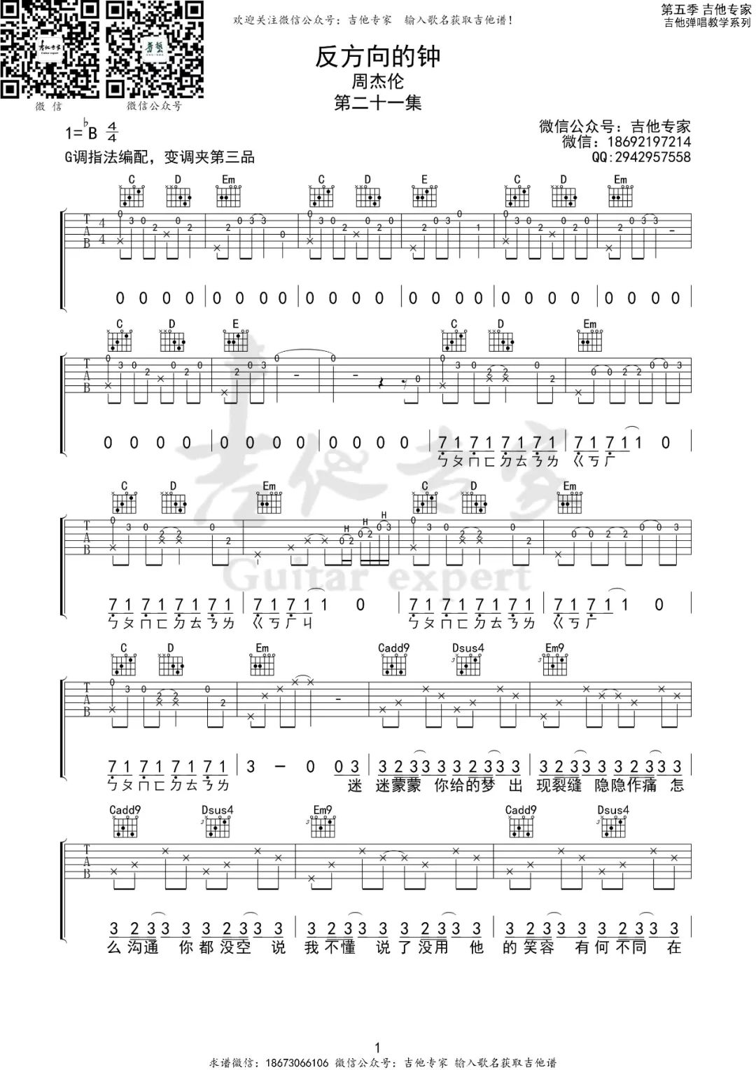 《周杰伦《反方向的钟吉他谱》(G调)》内容来自于互联网,不能保证内容的准确性与完整性,仅供学习交流欣赏,请勿用于其它用途,内容版权归原作者及来源网站所有,如有侵犯到您的权益请来信告知,我们将及时删除。