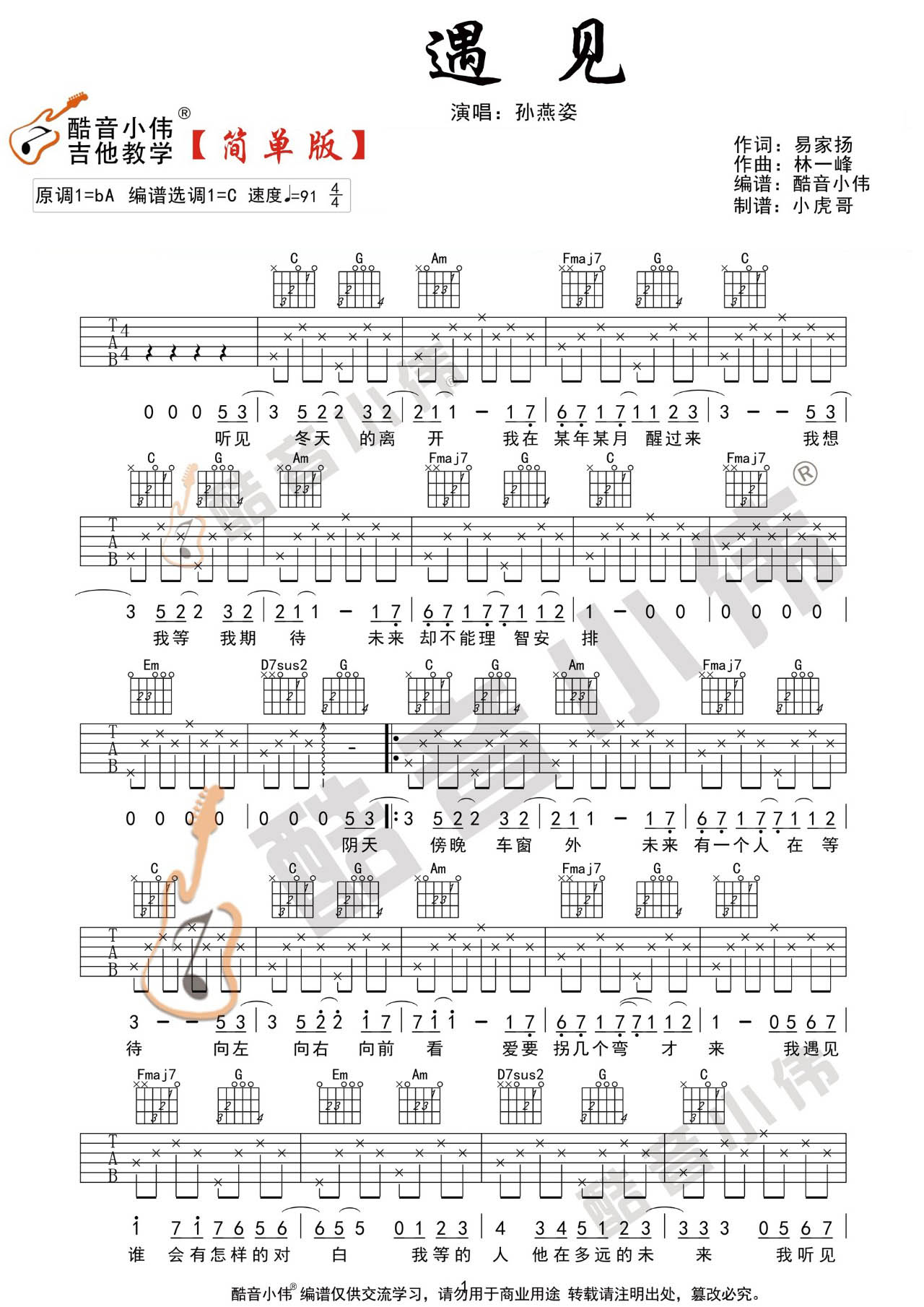 《孙燕姿《遇见吉他谱》(C调)》内容来自于互联网,不能保证内容的准确性与完整性,仅供学习交流欣赏,请勿用于其它用途,内容版权归原作者及来源网站所有,如有侵犯到您的权益请来信告知,我们将及时删除。