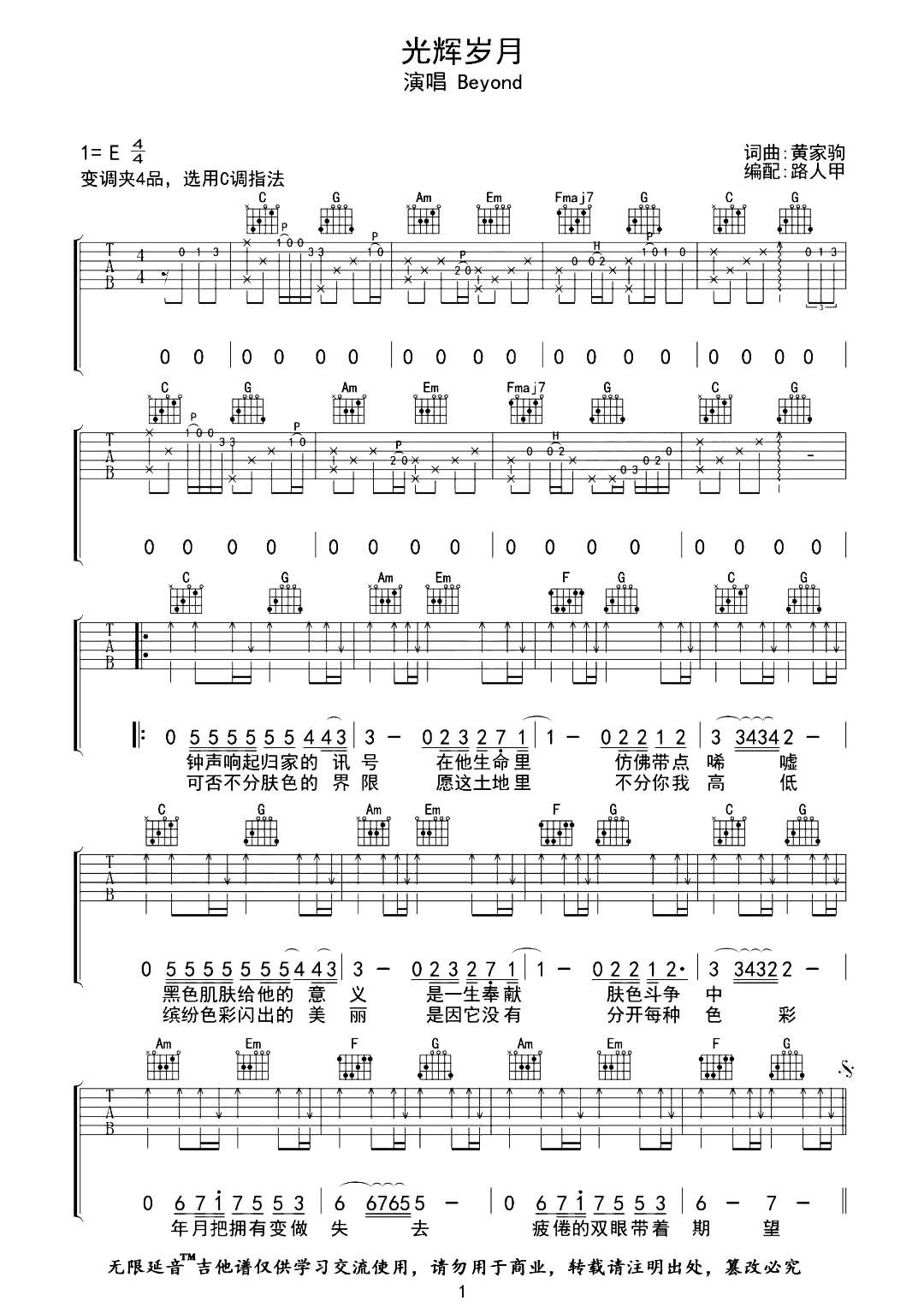 《Beyond《光辉岁月吉他谱》(C调)》内容来自于互联网,不能保证内容的准确性与完整性,仅供学习交流欣赏,请勿用于其它用途,内容版权归原作者及来源网站所有,如有侵犯到您的权益请来信告知,我们将及时删除。