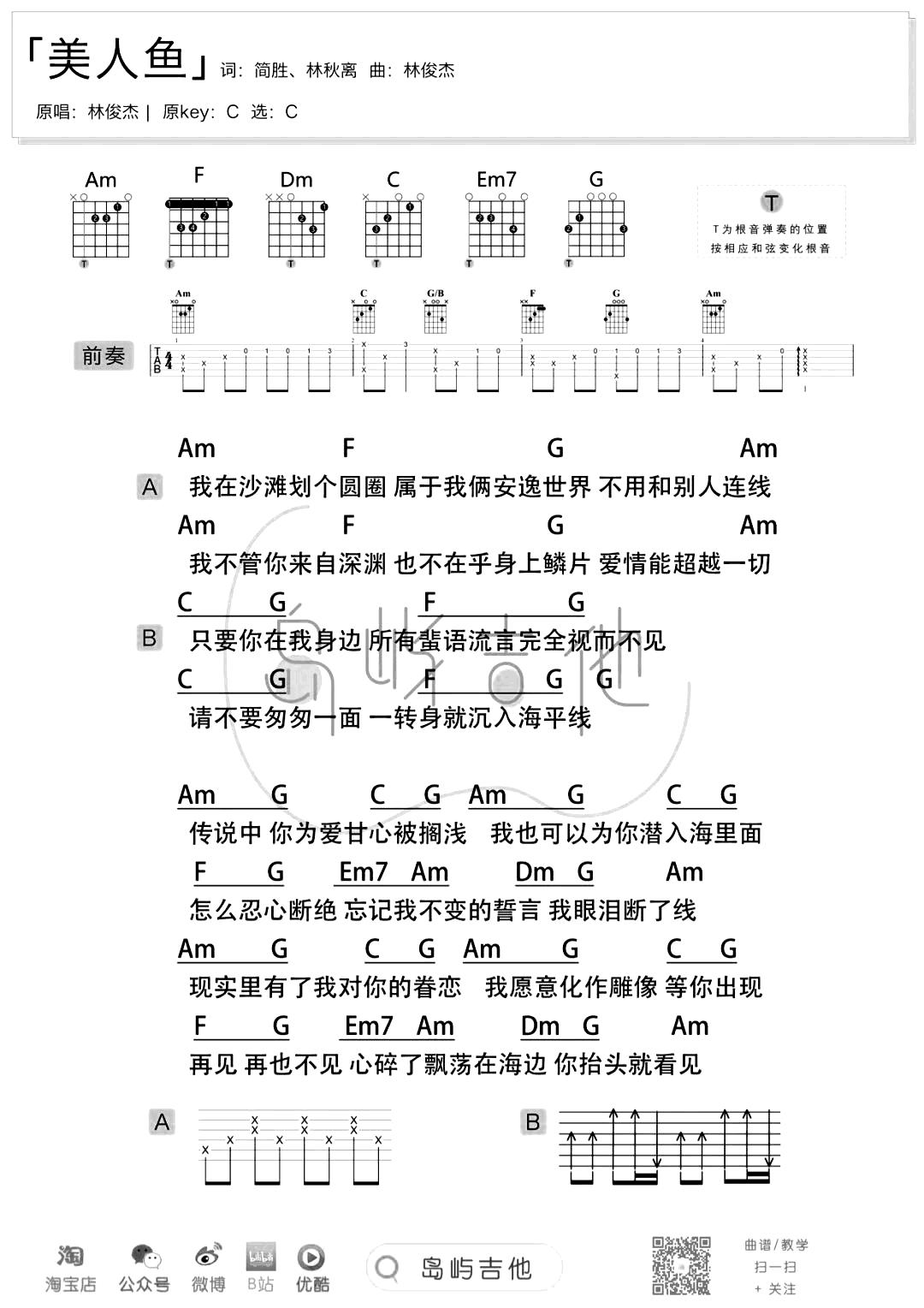 《林俊杰《美人鱼吉他谱》(C调)》内容来自于互联网,不能保证内容的准确性与完整性,仅供学习交流欣赏,请勿用于其它用途,内容版权归原作者及来源网站所有,如有侵犯到您的权益请来信告知,我们将及时删除。